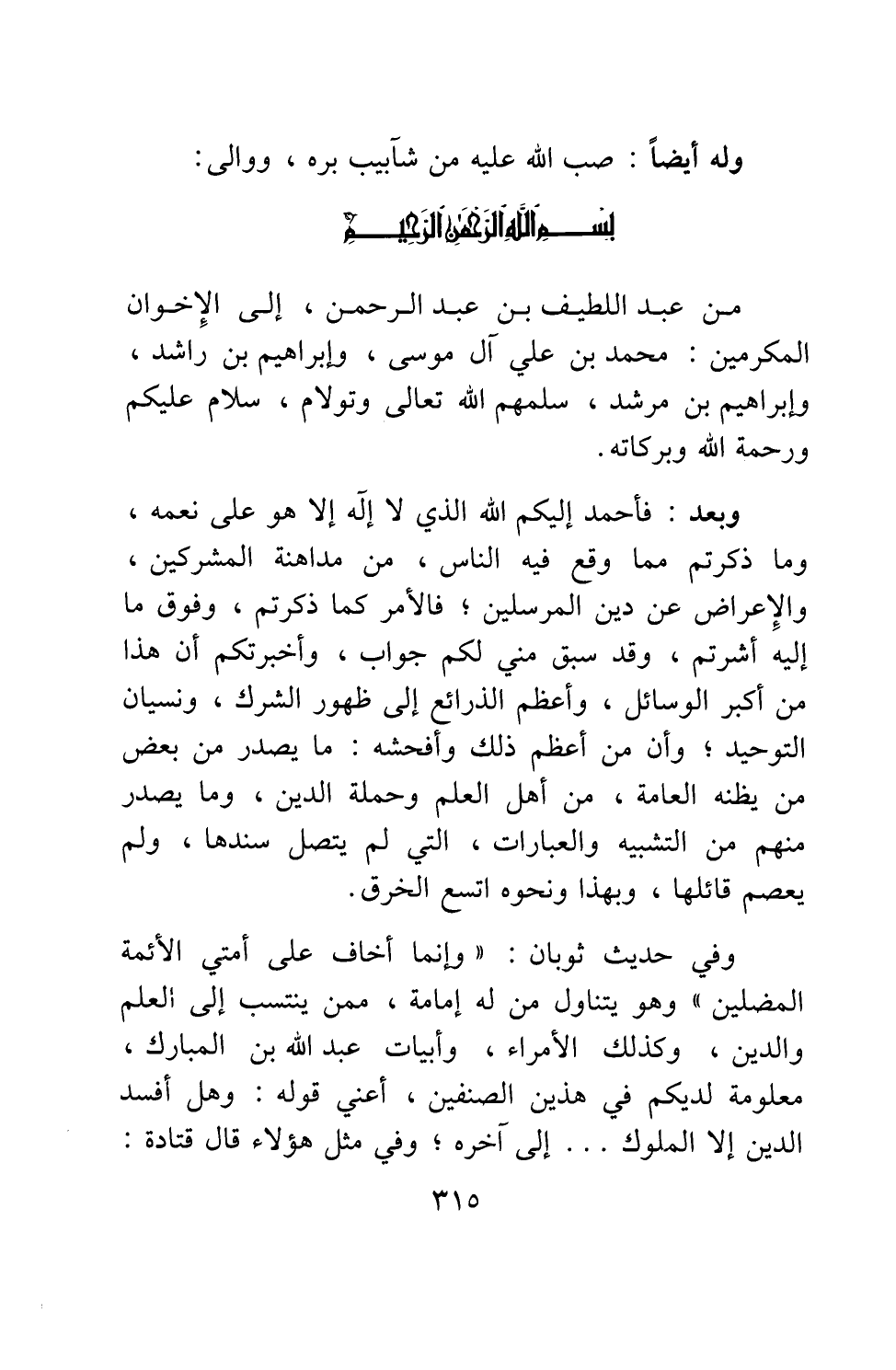 وبعد، فأحمد إليكم الله الذي لا إله إلا هو على نعمه. وما ذكرتم مما وقع فيه الناس، من مداهنة المشركين والإعراض عن دين المرسلين، فالأمر كما ذكرتم، وفوق ما إليه أشرتم؛ وقد سبق مني لكم جواب، وأخبرتكم أن هذا من أكبر الوسائل وأعظم الذرائع إلى ظهور الشرك، ونسيان التوحيد، وأن من أعظم ذلك وأفحشه: ما يصدر من بعض من يظنه العامة، من أهل العلم وحملة الدين، وما يصدر منهم من التشبيه والعبارات التي لم يتصل سندها، ولم يعصم قائلها، وبهذا ونحوه اتسع الخرق.