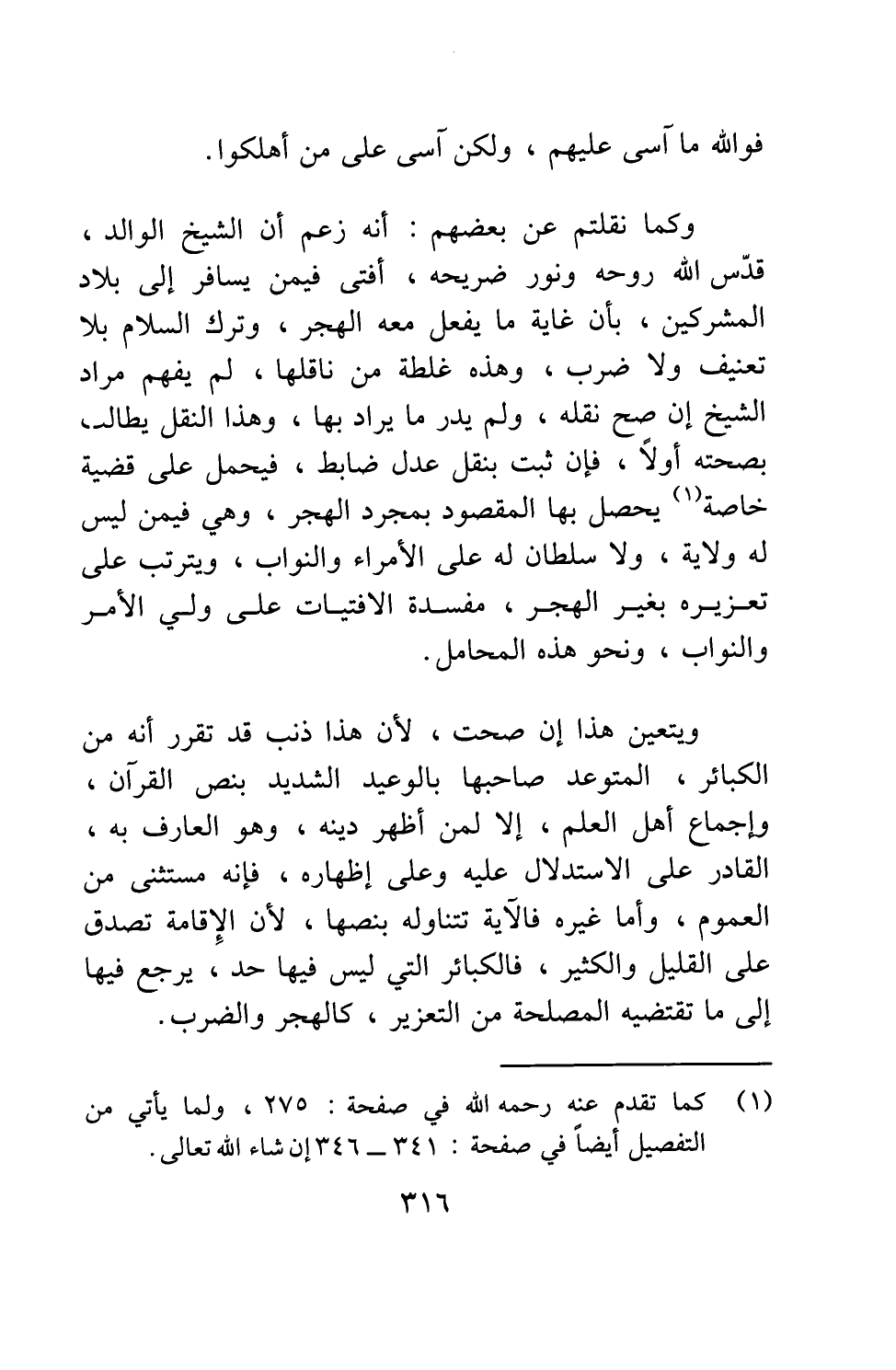 "فوالله ما آسى عليهم، ولكن آسى على من أهلكوا". وكما نقلتم عن بعضهم: أنه زعم أن الشيخ الوالد، قدس الله روحه ونور ضريحه، أفتى فيمن يسافر إلى بلاد المشركين، بأن غاية ما يفعل معه: الهجر وترك السلام، بلا تعنيف ولا ضرب؛ وهذه غلطة من ناقلها، لم يفهم مراد الشيخ إن صح نقله، ولم يدر ما يراد بها. وهذا النقل يطالب بصحته أولاً، فإن ثبت بنقل عدل ضابط، فيحمل على قضية خاصة 1 يحصل بها المقصود بمجرد الهجر، وهي فيمن ليس له ولاية، ولا سلطان له على الأمراء والنواب، ويترتب على تعزيره بغير الهجر، مفسدة الافتيات على ولي الأمر والنواب، ونحو هذه المحامل.