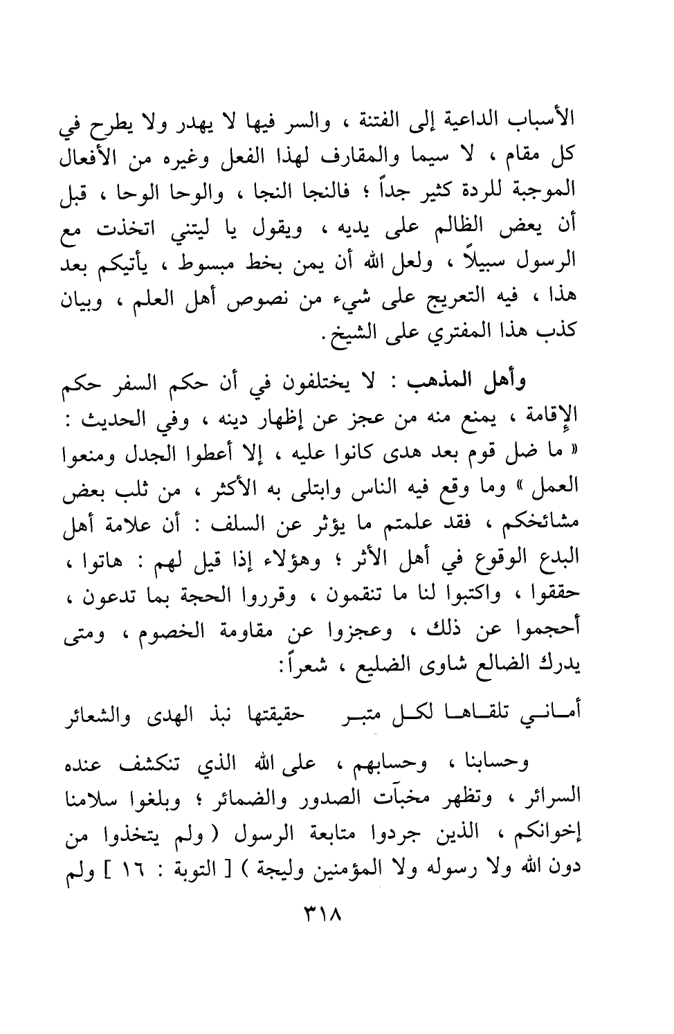 الأسباب الداعية إلى الفتنة، والسر فيها لا يهدر ولا يطرح في كل مقام، لا سيما والمقارف لهذا الفعل وغيره من الأفعال الموجبة للردة كثير جداً. فالنجا النجا! والوحا الوحا! قبل أن يعض الظالم على يديه، ويقول: يا ليتني اتخذت مع الرسول سبيلاً. ولعل الله أن يمن بخط مبسوط، يأتيكم بعد هذا، فيه التعريج على شيء من نصوص أهل العلم، وبيان كذب هذا المفتري على الشيخ.