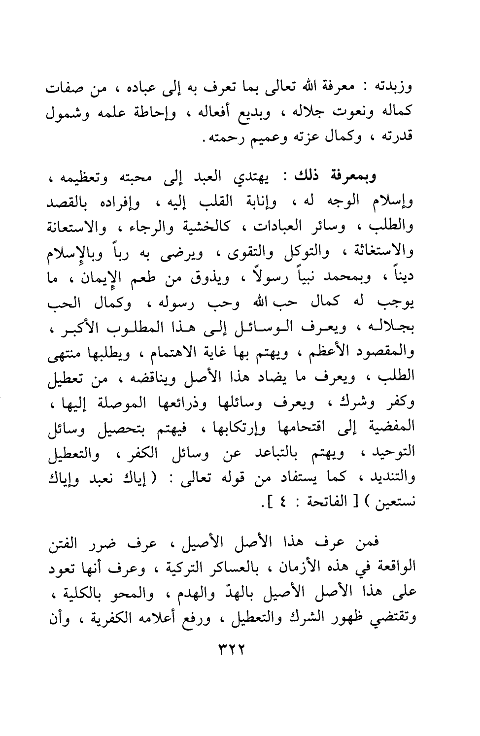 فمن عرف هذا الأصل الأصيل، عرف ضرر الفتن الواقعة في هذه الأزمان، بالعساكر التركية، وعرف أنها تعود على هذا الأصل الأصيل بالهدّ والهدم، والمحو بالكلية، وتقتضي ظهور الشرك والتعطيل، ورفع أعلامه الكفرية، وأن