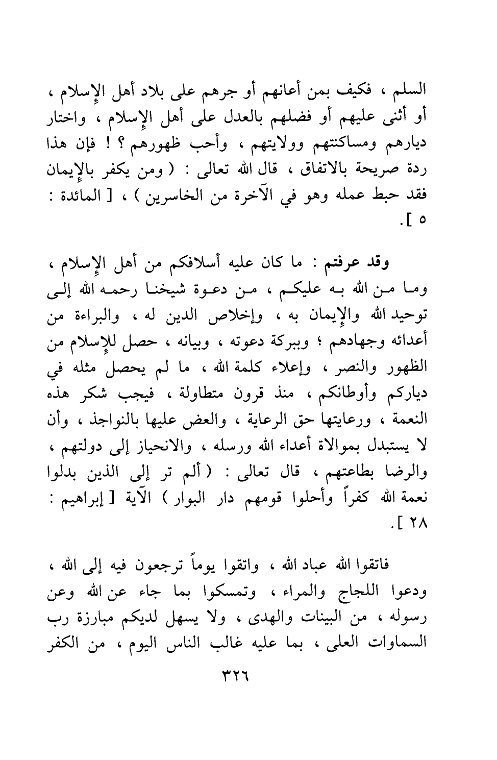 وقد عرفتم ما كان عليه أسلافكم من أهل الإسلام، وما مَنَّ الله به عليكم، من دعوة شيخنا، رحمه الله، إلى توحيد الله والإيمان به، وإخلاص الدين له، والبراءة من أعدائه وجهادهم. وببركة دعوته وبيانه، حصل للإسلام من الظهور والنصر، وإعلاء كلمة الله، ما لم يحصل مثله في دياركم وأوطانكم منذ قرون متطاولة. فيجب شكر هذه النعمة، ورعايتها حق الرعاية، والعض عليها بالنواجذ، وأن لا يستبدل بموالاة أعداء الله ورسله، والانحياز إلى دولتهم، والرضى بطاعتهم، قال تعالى: {أَلَمْ تَرَ إِلَى الَّذِينَ بَدَّلُوا نِعْمَتَ اللَّهِ كُفْراً وَأَحَلُّوا قَوْمَهُمْ دَارَ الْبَوَارِ} الآية [سورة إبراهيم آية: 28] .