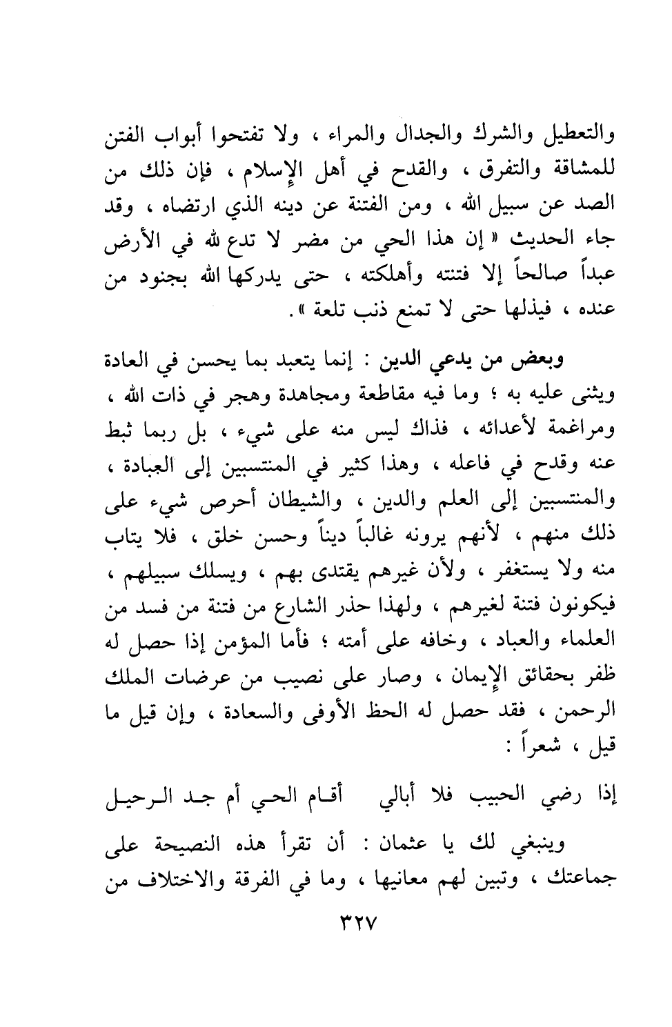 والتعطيل والشرك والجدال والمراء. ولا تفتحوا أبواب الفتن للمشاقة والتفرق، والقدح في أهل الإسلام؛ فإن ذلك من الصد عن سبيل الله، ومن الفتنة عن دينه الذي ارتضاه. وقد جاء الحديث: " إن هذا الحي من مضر لا تدع لله في الأرض عبداً صالحاً إلا فتنته وأهلكته، حتى يدركها الله بجنود من عنده، فيذلها حتى لا تمنع ذنب تلعة " 1.