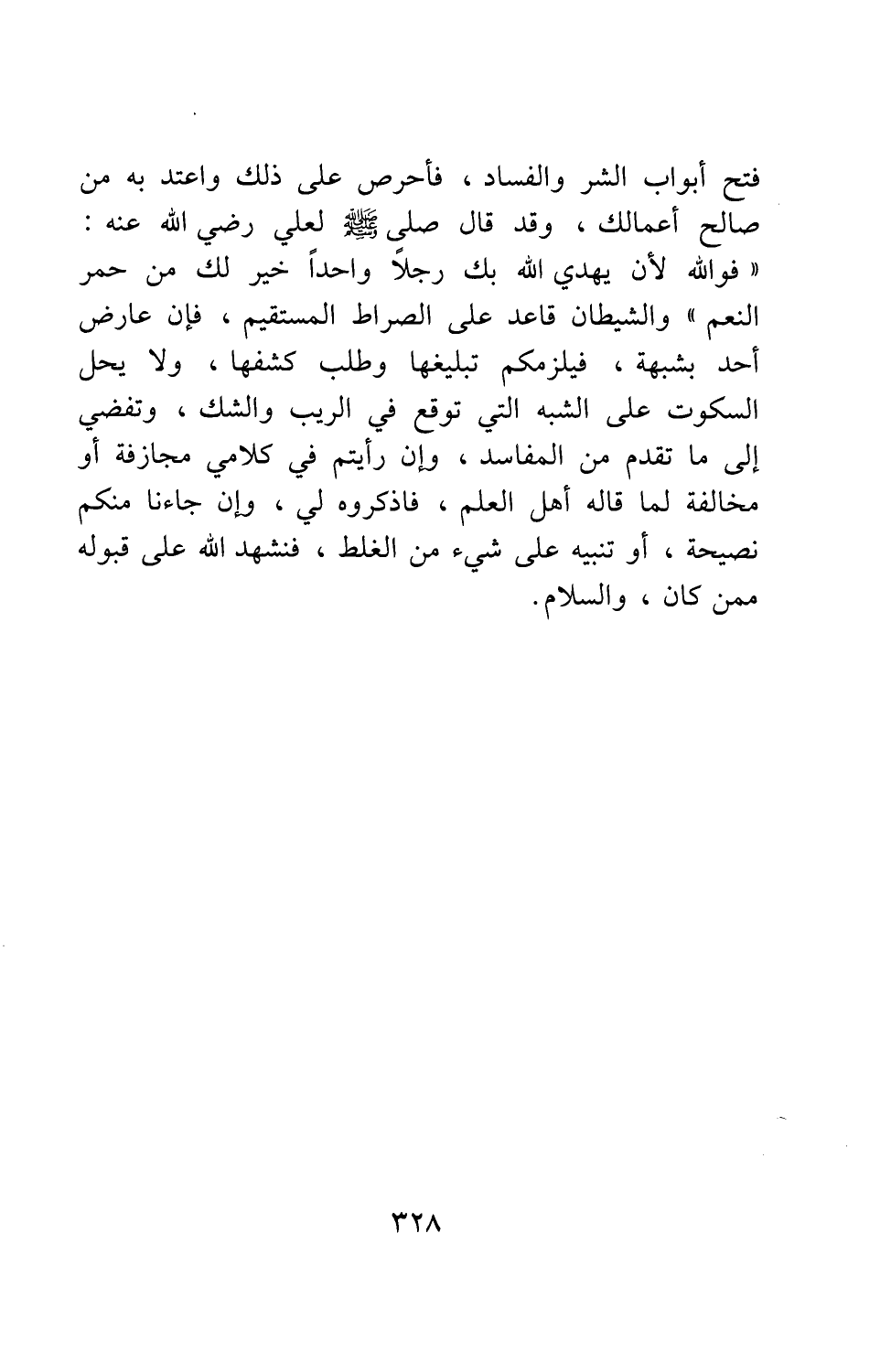 فتح أبواب الشر والفساد. فاحرص على ذلك واعتد به من صالح أعمالك، وقد قال صلى الله عليه وسلم لعلي رضي الله عنه: " فوالله لأن يهدي الله بك رجلاً واحداً خير لك من حمر النعم " 1. والشيطان قاعد على الصراط المستقيم، فإن عارض أحد بشبهة، فيلزمكم تبليغها وطلب كشفها؛ ولا يحل السكوت على الشبه التي توقع في الريب والشك، وتفضي إلى ما تقدم من المفاسد. وإن رأيتم في كلامي مجازفة أو مخالفة لما قاله أهل العلم، فاذكروه لي؛ وإن جاءنا منكم نصيحة، أو تنبيه على شيء من الغلط، فنشهد الله على قبوله ممن كان. والسلام.