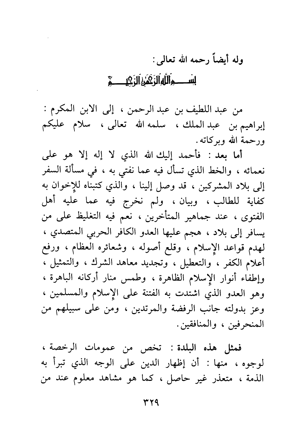 أما بعد، فأحمد إليك الله الذي لا إله إلا هو على نعمائه، والخط الذي تسأل فيه عما نفتي به، في مسألة السفر إلى بلاد المشركين، قد وصل إلين. والذي كتبناه للإخوان به كفاية للطالب وبيان، ولم نخرج فيه عما عليه أهل الفتوى، عند جماهير المتأخرين؛ نعم، فيه التغليظ على من يسافر إلى بلاد، هجم عليها العدو الكافر الحربي المتصدي، لهدم قواعد الإسلام، وقلع أصوله وشعائره العظام، ورفع أعلام الكفر والتعطيل، وتجديد معاهد الشرك والتمثيل، وإطفاء أنوار الإسلام الظاهرة، وطمس منار أركانه الباهرة. وهو العدو الذي اشتدت به الفتنة على الإسلام والمسلمين، وعز بدولته جانب الرافضة والمرتدين، ومن على سبيلهم من المنحرفين والمنافقين.