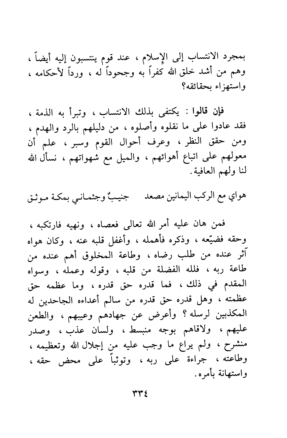 فإن قالوا: يكتفى بذلك الانتساب، وتبرأ به الذمة، فقد عادوا على ما نقلوه وأصلوه، من دليلهم بالرد والهدم. ومن حقق النظر، وعرف أحوال القوم وسبر، علم أن معولهم على اتباع أهوائهم، والميل مع شهواتهم. نسأل الله لنا ولهم العافية.