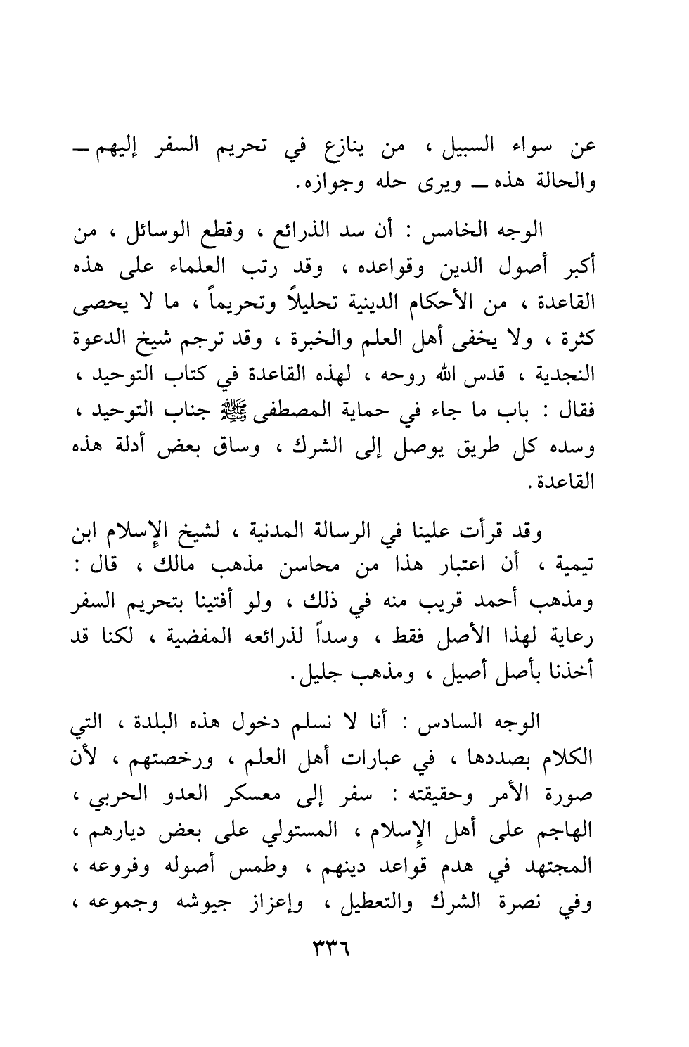 الوجه الخامس: أن سد الذرائع، وقطع الوسائل، من أكبر أصول الدين وقواعده؛ وقد رتب العلماء على هذه القاعدة، من الأحكام الدينية تحليلاً وتحريماً، ما لا يحصى كثرة، ولا يخفى أهل العلم والخبرة. وقد ترجم شيخ الدعوة النجدية، قدس الله روحه، لهذه القاعدة في كتاب التوحيد، فقال: باب ما جاء في حماية المصطفى صلى الله عليه وسلم جناب التوحيد، وسده كل طريق يوصل إلى الشرك، وساق بعض أدلة هذه القاعدة.