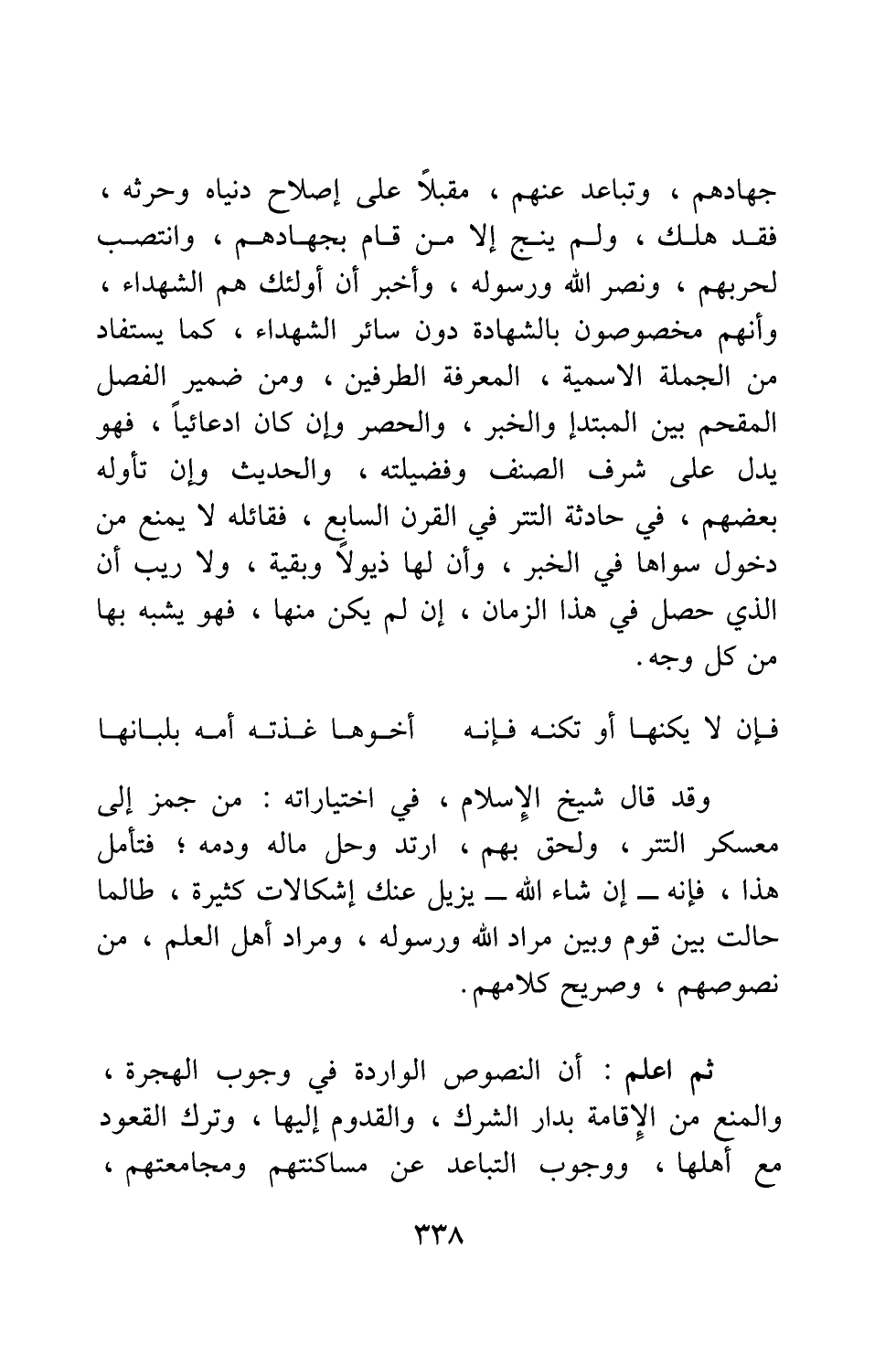 جهادهم، وتباعد عنهم، مقبلاً على إصلاح دنياه وحرثه، فقد هلك، ولم ينج إلا من قام بجهادهم، وانتصب لحربهم، ونصر الله ورسوله. وأخبر أن أولئك هم الشهداء، وأنهم مخصوصون بالشهادة دون سائر الشهداء، كما يستفاد من الجملة الاسمية، المعرفة الطرفين، ومن ضمير الفصل المقحم بين المبتدإ والخبر؛ والحصر وإن كان ادعائياً، فهو يدل على شرف الصنف وفضيلته. والحديث وإن تأوله بعضهم، في حادثة التتر في القرن السابع، فقائله لا يمنع من دخول سواها في الخبر، وأن لها ذيولاً وبقية؛ ولا ريب أن الذي حصل في هذا الزمان، إن لم يكن منها، فهو يشبه بها من كل وجه.