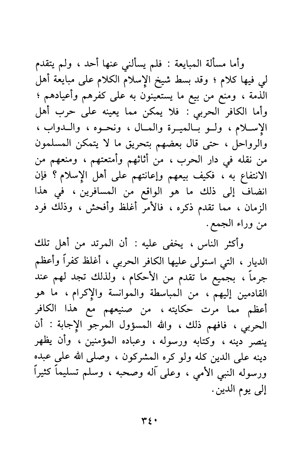 وأما مسألة المبايعة، فلم يسألني عنها أحد، ولم يتقدم لي فيها كلام. وقد بسط شيخ الإسلام الكلام على مبايعة أهل الذمة، ومنع من بيع ما يستعينون به على كفرهم وأعيادهم. وأما الكافر الحربي، فلا يمكن مما يعينه على حرب أهل الإسلام، ولو بالميرة والمال ونحوه، والدواب، والرواحل، حتى قال بعضهم بتحريق ما لا يتمكن المسلمون من نقله في دار الحرب، من أثاثهم وأمتعتهم، ومنعهم من الانتفاع به. فكيف بيعهم وإعانتهم على أهل الإسلام؟ فإن انضاف إلى ذلك ما هو الواقع من المسافرين، في هذا الزمان، مما تقدم ذكره، فالأمر أغلظ وأفحش، وذلك فرد من وراء الجمع.