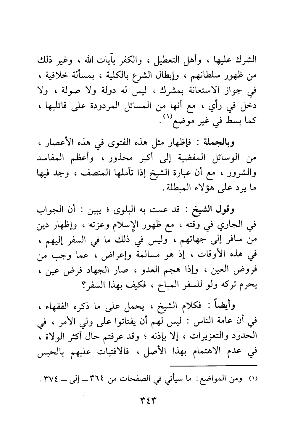 وبالجملة: فإظهار مثل هذه الفتوى في هذه الأعصار، من الوسائل المفضية إلى أكبر محذور، وأعظم المفاسد والشرور، مع أن عبارة الشيخ إذا تأملها المنصف، وجد فيها ما يرد على هؤلاء المبطلة.