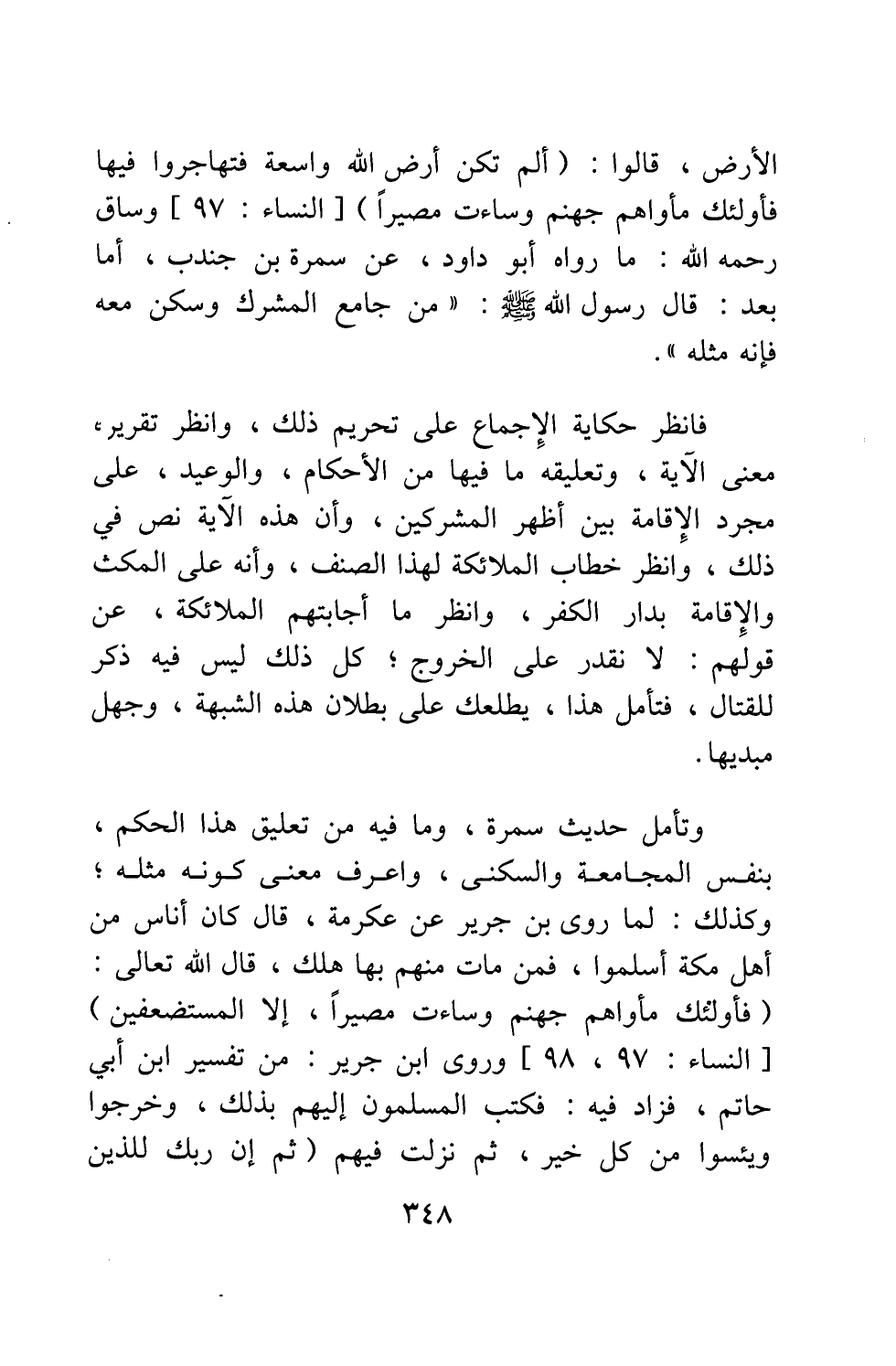 فانظر حكاية الإجماع على تحريم ذلك، وانظر تقريره معنى الآية، وتعليقه ما فيها من الأحكام، والوعيد على مجرد الإقامة بين أظهر المشركين، وأن هذه الآية نص في ذلك. وانظر خطاب الملائكة لهذا الصنف، وأنه على المكث والإقامة بدار الكفر. وانظر ما أجابتهم الملائكة عن قولهم: لا نقدر على الخروج. كل ذلك ليس فيه ذكر للقتال؛ فتأمل هذا، يطلعك على بطلان هذه الشبهة، وجهل مبديها.