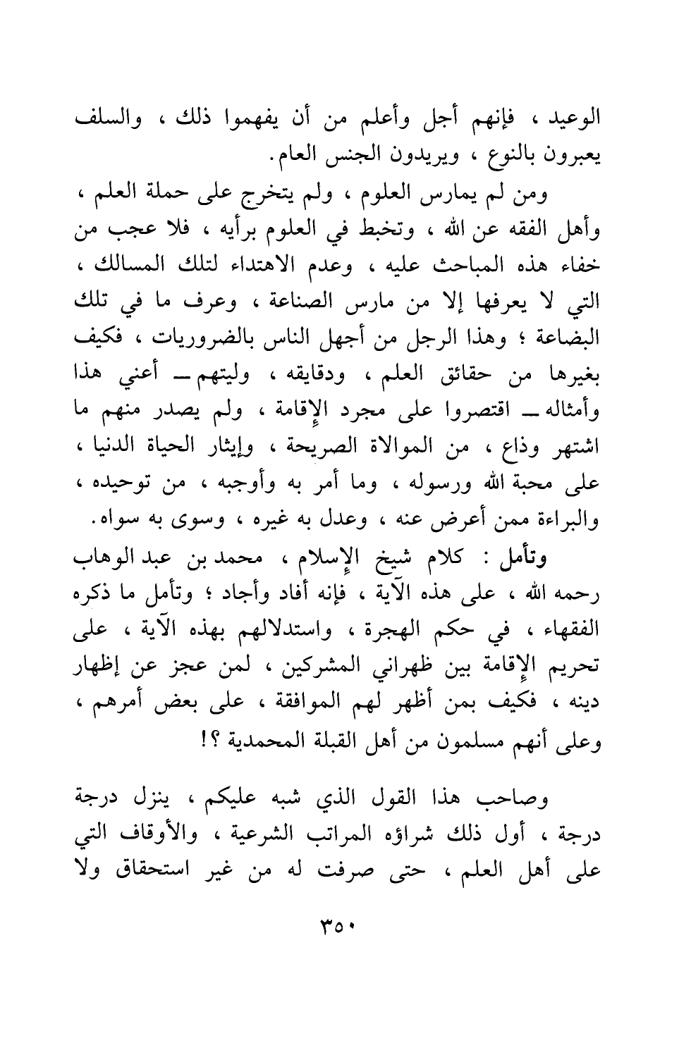 ومن لم يمارس العلوم، ولم يتخرج على حملة العلم وأهل الفقه عن الله، وتخبط في العلوم برأيه، فلا عجب من خفاء هذه المباحث عليه، وعدم الاهتداء لتلك المسالك، التي لا يعرفها إلا من مارس الصناعة، وعرف ما في تلك البضاعة. وهذا الرجل من أجهل الناس بالضروريات، فكيف بغيرها من حقائق العلم، ودقائقه؟ وليتهم - أعني هذا وأمثاله - اقتصروا على مجرد الإقامة، ولم يصدر منهم ما اشتهر وذاع، من الموالاة الصريحة، وإيثار الحياة الدنيا، على محبة الله ورسوله، وما أمر به وأوجبه من توحيده، والبراءة ممن أعرض عنه، وعدل به غيره، وسوى به سواه.