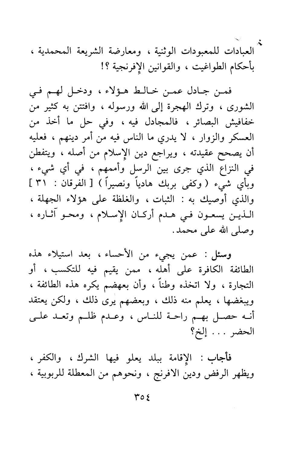 فمن جادل عمن خالط هؤلاء، ودخل لهم في الشورى، وترك الهجرة إلى الله ورسوله، وافتتن به كثير من خفافيش البصائر، فالمجادل فيه، وفي حل ما أخذ من العسكر والزوار، لا يدري ما الناس فيه من أمر دينهم، فعليه أن يصحح عقيدته، ويراجع دين الإسلام من أصله، ويتفطن في النزاع الذي جرى بين الرسل وأممهم، في أي شيء؟ وبأي شيء؟ {وَكَفَى بِرَبِّكَ هَادِياً وَنَصِيراً} [سورة الفرقان آية: 31] . والذي أوصيك به: الثبات، والغلظة على هؤلاء الجهلة، الذين يسعون في هدم أركان الإسلام، ومحو آثاره. وصلى الله على محمد.
