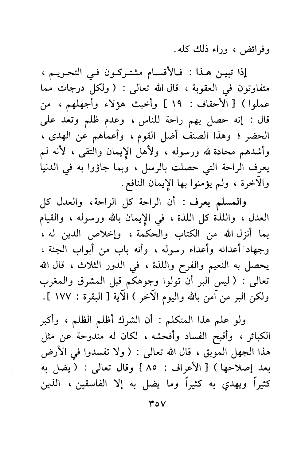 وفرائض، وراء ذلك كله. إذا تبين هذا، فالأقسام مشتركون في التحريم، متفاوتون في العقوبة، قال الله تعالى: {وَلِكُلٍّ دَرَجَاتٌ مِمَّا عَمِلُوا} [سورة الأنعام آية: 132] . وأخبث هؤلاء وأجهلهم، من قال: إنه حصل بهم راحة للناس، وعدم ظلم وتعد على الحضر; وهذا الصنف أضل القوم، وأعماهم عن الهدى، وأشدهم محادة لله ورسوله، ولأهل الإيمان والتقى، لأنه لم يعرف الراحة التي حصلت بالرسل، وبما جاؤوا به في الدنيا والآخرة، ولم يؤمنوا بها الإيمان النافع.