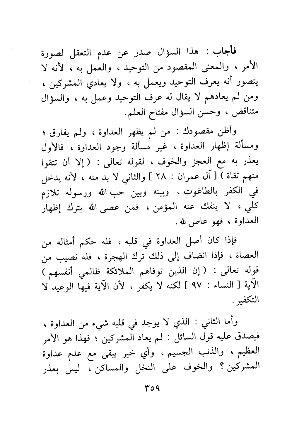والثاني: لا بد منه، لأنه يدخل في الكفر بالطاغوت، وبينه وبين حب الله ورسوله تلازم كلي، لا ينفك عنه المؤمن؛ فمن عصى الله بترك إظهار العداوة، فهو عاص لله. فإذا كان أصل العداوة في قلبه، فله حكم أمثاله من العصاة، فإذا انضاف إلى ذلك ترك الهجرة، فله نصيب من قوله تعالى: {إِنَّ الَّذِينَ تَوَفَّاهُمُ الْمَلائِكَةُ ظَالِمِي أَنْفُسِهِمْ} الآية [سورة النساء آية: 97] ، لكنه لا يكفر، لأن الآية فيها الوعيد لا التكفير. وأما الثاني، الذي لا يوجد في قلبه شيء من العداوة، فيصدق عليه قول السائل: لم يعاد المشركين; فهذا هو الأمر العظيم، والذنب الجسيم، وأي خير يبقى مع عدم عداوة المشركين؟ والخوف على النخل والمساكن ليس بعذر