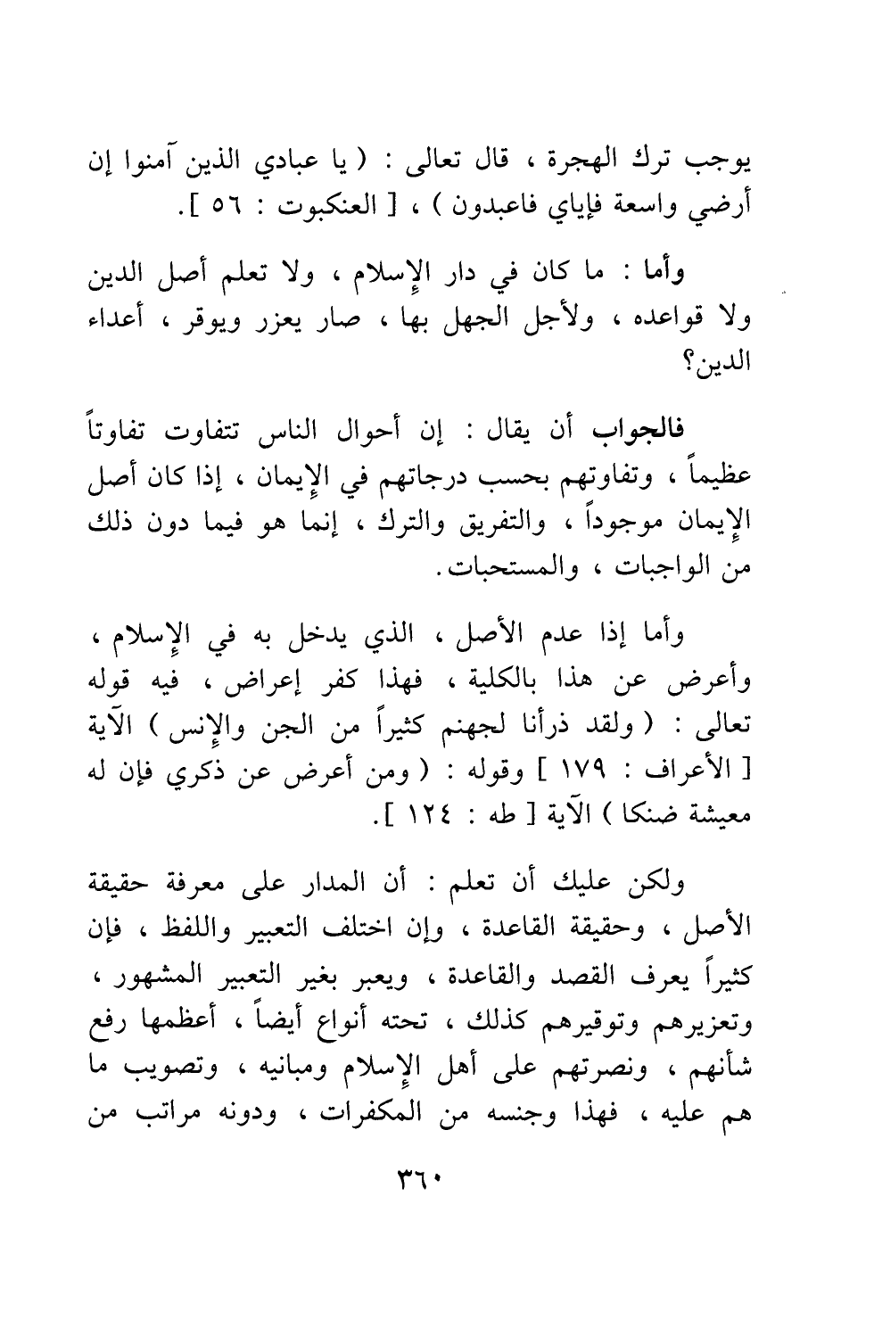 فالجواب أن يقال: إن أحوال الناس تتفاوت تفاوتاً عظيماً، وتفاوتهم بحسب درجاتهم في الإيمان، إذا كان أصل الإيمان موجوداً؛ والتفريق والترك، إنما هو فيما دون ذلك من الواجبات، والمستحبات. وأما اذا عدم الأصل الذي يدخل به في الإسلام، وأعرض عن هذا بالكلية، فهذا كفر إعراض، فيه قوله تعالى: {وَلَقَدْ ذَرَأْنَا لِجَهَنَّمَ كَثِيراً مِنَ الْجِنِّ وَالْأِنْسِ} الآية [سورة الأعراف آية: 179] ، وقوله: {وَمَنْ أَعْرَضَ عَنْ ذِكْرِي فَإِنَّ لَهُ مَعِيشَةً ضَنْكاً} الآية [سورة طه آية: 124] . ولكن عليك أن تعلم: أن المدار على معرفة حقيقة الأصل وحقيقة القاعدة، وإن اختلف التعبير واللفظ؛ فإن كثيراً يعرف القصد والقاعدة، ويعبر بغير التعبير المشهور. وتعزيرهم وتوقيرهم كذلك، تحته أنواع أيضاً، أعظمها: رفع شأنهم، ونصرتهم على أهل الإسلام ومبانيه، وتصويب ما هم عليه؛ فهذا وجنسه من المكفرات، ودونه مراتب من