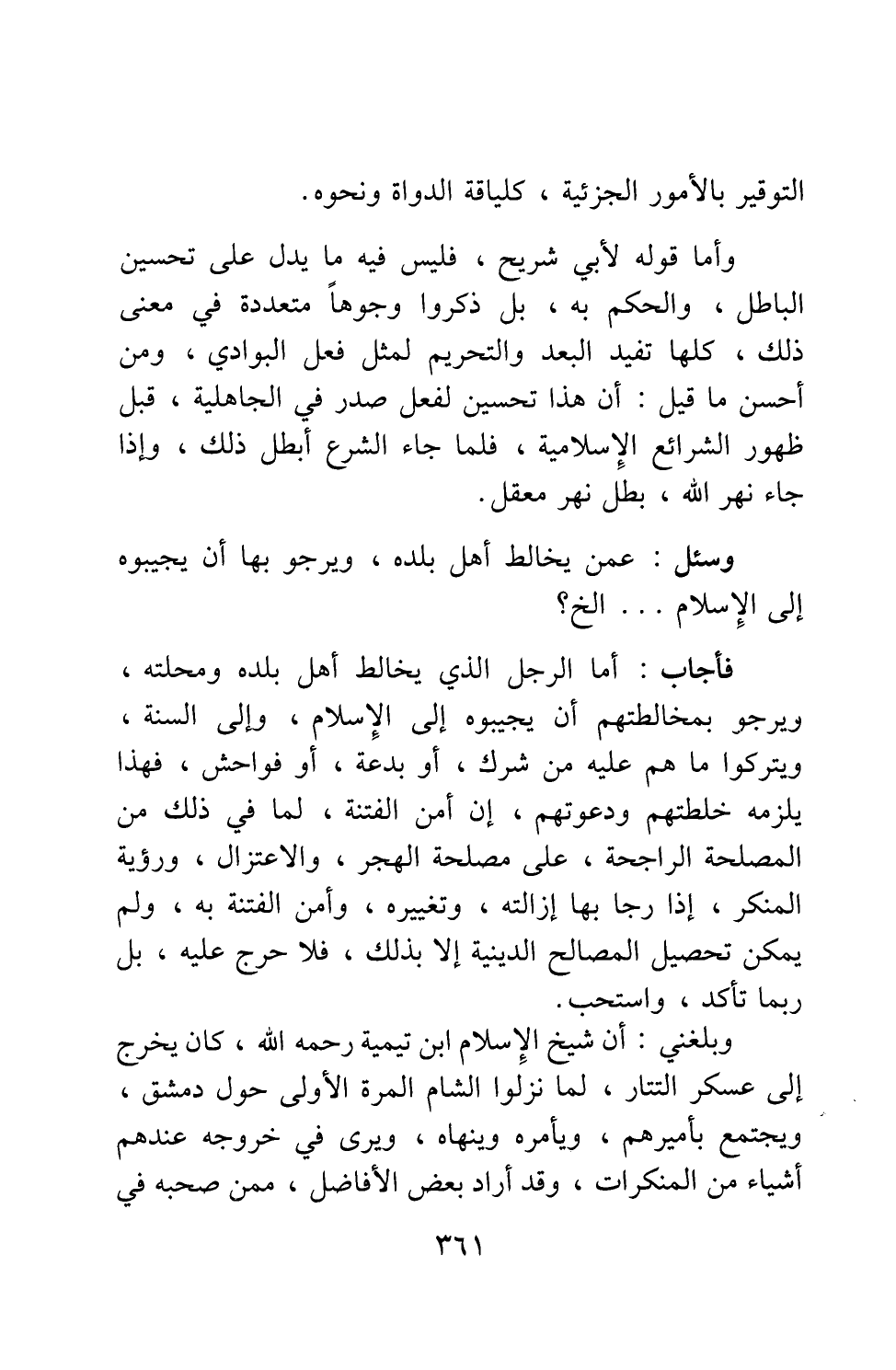 فأجاب: أما الرجل الذي يخالط أهل بلده ومحلته، ويرجو بمخالطتهم أن يجيبوه إلى الإسلام، وإلى السنة، ويتركوا ما هم عليه من شرك، أو بدعة، أو فواحش، فهذا يلزمه خلطتهم ودعوتهم، إن أمن الفتنة، لما في ذلك من المصلحة الراجحة، على مصلحة الهجر والاعتزال. ورؤية المنكر، إذا رجا بها إزالته وتغييره، وأمن الفتنة به، ولم يمكن تحصيل المصالح الدينية إلا بذلك، فلا حرج عليه، بل ربما تأكد، واستحب.