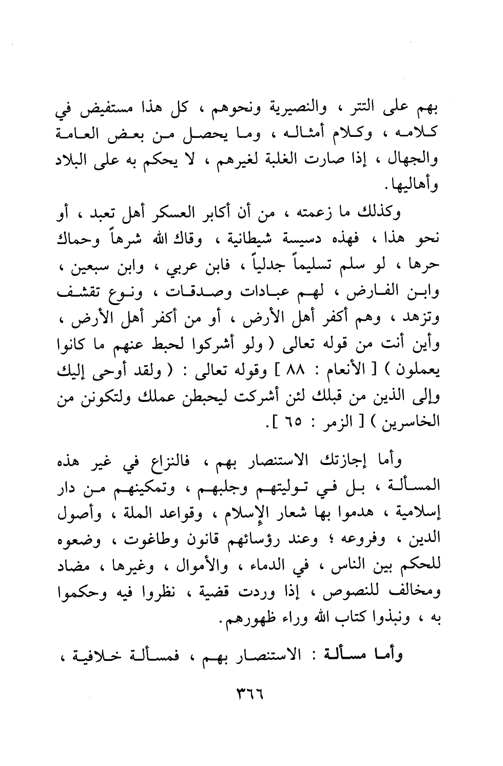 بهم على التتر، والنصيرية ونحوهم؛ كل هذا مستفيض في كلامه، وكلام أمثاله. وما يحصل من بعض العامة والجهال، إذا صارت الغلبة لغيرهم، لا يحكم به على البلاد وأهاليها.