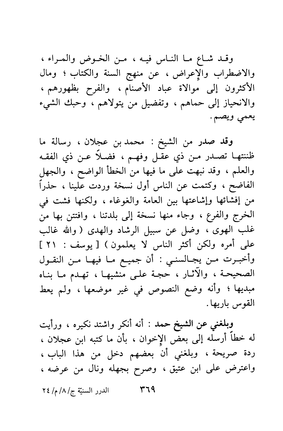 وقد صدر من الشيخ محمد بن عجلان، رسالة ما ظننتها تصدر من ذي عقل وفهم، فضلاً عن ذي الفقه والعلم؛ وقد نبهت على ما فيها من الخطإ الواضح، والجهل الفاضح، وكتمت عن الناس أول نسخة وردت علينا، حذراً من إفشائها وإشاعتها بين العامة والغوغاء، ولكنها فشت في الخرج والفرع، وجاء منها نسخة إلى بلدتنا، وافتتن بها من غلب الهوى، وضل عن سبيل الرشاد والهدى. {وَاللَّهُ غَالِبٌ عَلَى أَمْرِهِ وَلَكِنَّ أَكْثَرَ النَّاسِ لا يَعْلَمُونَ} [سورة يوسف آية: 21] . وأخبرت من يجالسني: أن جميع ما فيها من النقول الصحيحة والآثار، حجة على منشيها، تهدم ما بناه مبديها، وأنه وضع النصوص في غير موضعها، ولم يعط القوس باريها.