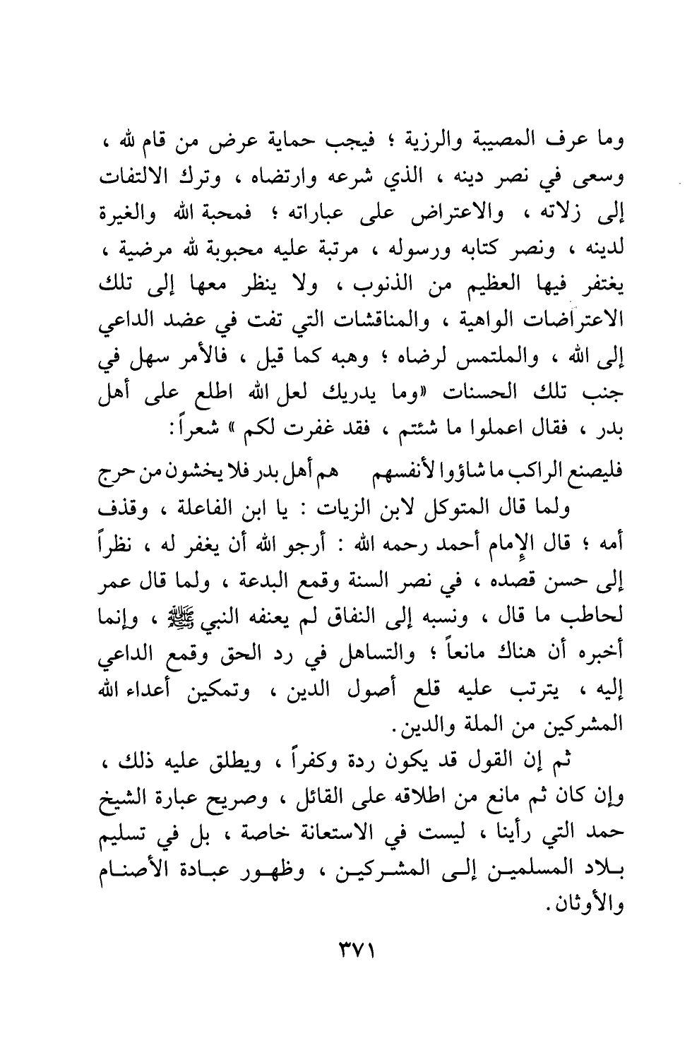 وما عرف المصيبة والرزية. فيجب حماية عرض من قام لله، وسعى في نصر دينه الذي شرعه وارتضاه، وترك الالتفات إلى زلاته، والاعتراض على عباراته; فمحبة الله والغيرة لدينه، ونصر كتابه ورسوله، مرتبة علية، محبوبة لله مرضية، يغتفر فيها العظيم من الذنوب، ولا ينظر معها إلى تلك الاعتراضات الواهية، والمناقشات التي تفت في عضد الداعي إلى الله، والملتمس لرضاه. وهبه كما قيل، فالأمر سهل في جنب تلك الحسنات، " وما يدريك؟ لعل الله اطلع على أهل بدر، فقال: اعملوا ما شئتم، فقد غفرت لكم " 1.