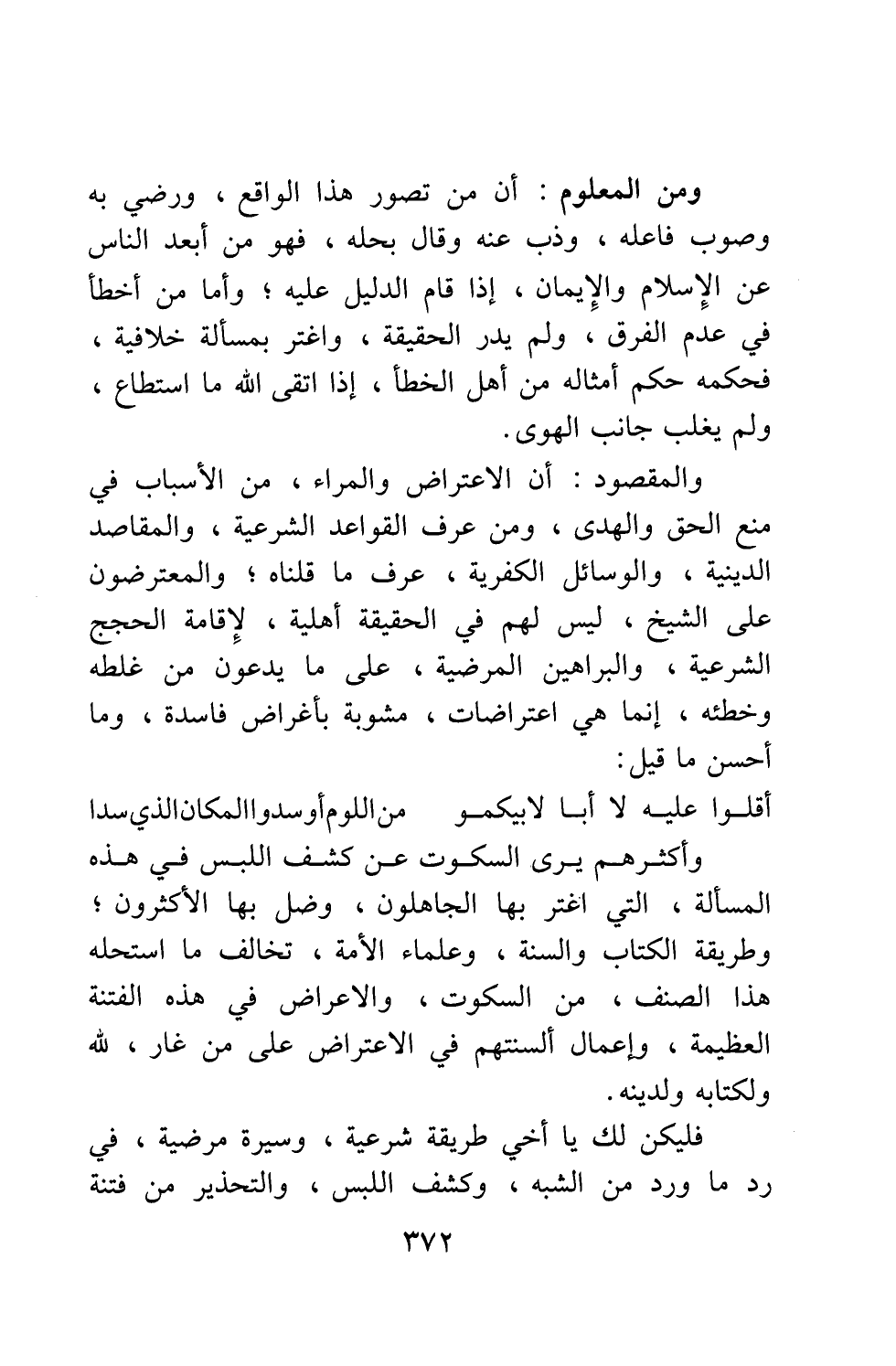 والمقصود: أن الاعتراض والمراء، من الأسباب في منع الحق والهدى، ومن عرف القواعد الشرعية، والمقاصد الدينية، والوسائل الكفرية، عرف ما قلناه. والمعترضون على الشيخ، ليس لهم في الحقيقة أهلية، لإقامة الحجج الشرعية، والبراهين المرضية، على ما يدعون من غلطه وخطئه، إنما هي اعتراضات مشوبة بأغراض فاسدة؛ وما أحسن ما قيل شعراً: