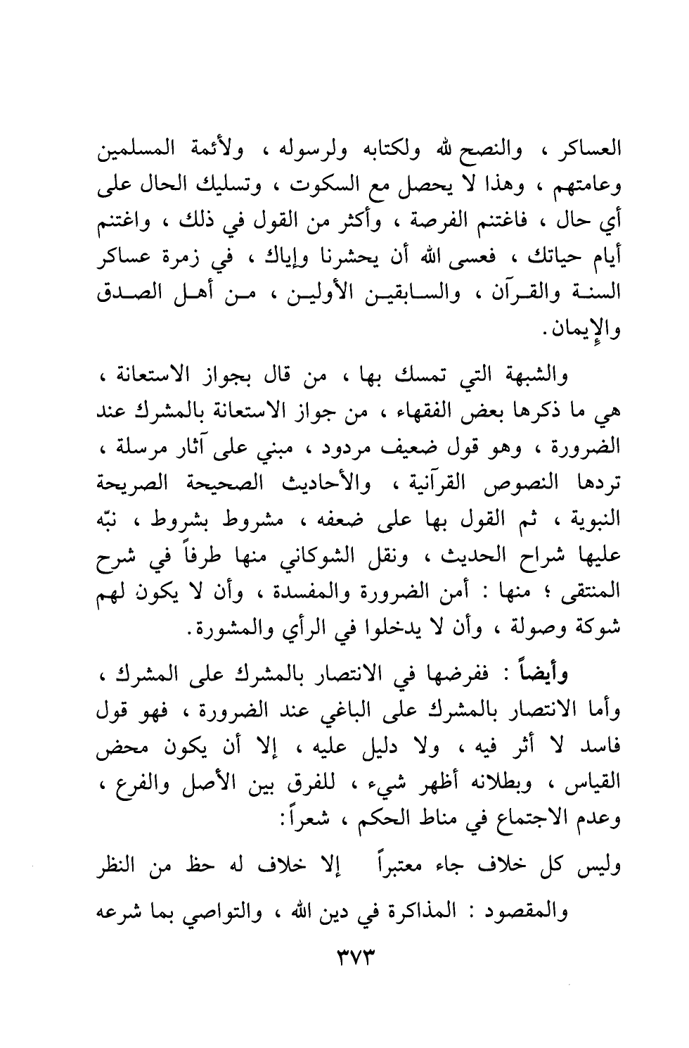 والشبهة التي تمسك بها من قال بجواز الاستعانة، هي ما ذكرها بعض الفقهاء، من جواز الاستعانة بالمشرك عند الضرورة؛ وهو قول ضعيف مردود، مبني على آثار مرسلة، تردها النصوص القرآنية، والأحاديث الصحيحة الصريحة النبوية. ثم القول بها على ضعفه، مشروط بشروط، نبّه عليها شراح الحديث، ونقل الشوكاني منها طرفاً في شرح المنتقى; منها: أمن الضرورة والمفسدة، وأن لا يكون لهم شوكة وصولة، وأن لا يدخلوا في الرأي والمشورة. وأيضاً، ففرضها في الانتصار بالمشرك على المشرك. وأما الانتصار بالمشرك على الباغي عند الضرورة، فهو قول فاسد لا أثر فيه، ولا دليل عليه، إلا أن يكون محض القياس، وبطلانه أظهر شيء، للفرق بين الأصل والفرع، وعدم الاجتماع في مناط الحكم. شعراً: