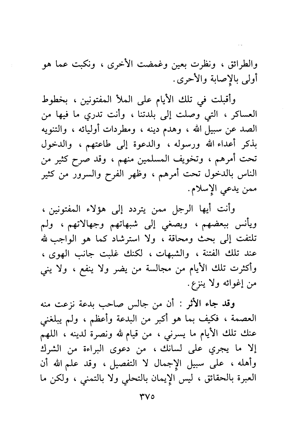 وأقبلت في تلك الأيام على الملإ المفتونين بخطوط العساكر التي وصلت إلى بلدتنا، وأنت تدري ما فيها من الصد عن سبيل الله، وهدم دينه، ومطردات أوليائه، والتنويه بذكر أعداء الله ورسوله، والدعوة إلى طاعتهم، والدخول تحت أمرهم، وتخويف المسلمين منهم؛ وقد صرح كثير من الناس بالدخول تحت أمرهم، وظهر الفرح والسرور من كثير ممن يدعي الإسلام.