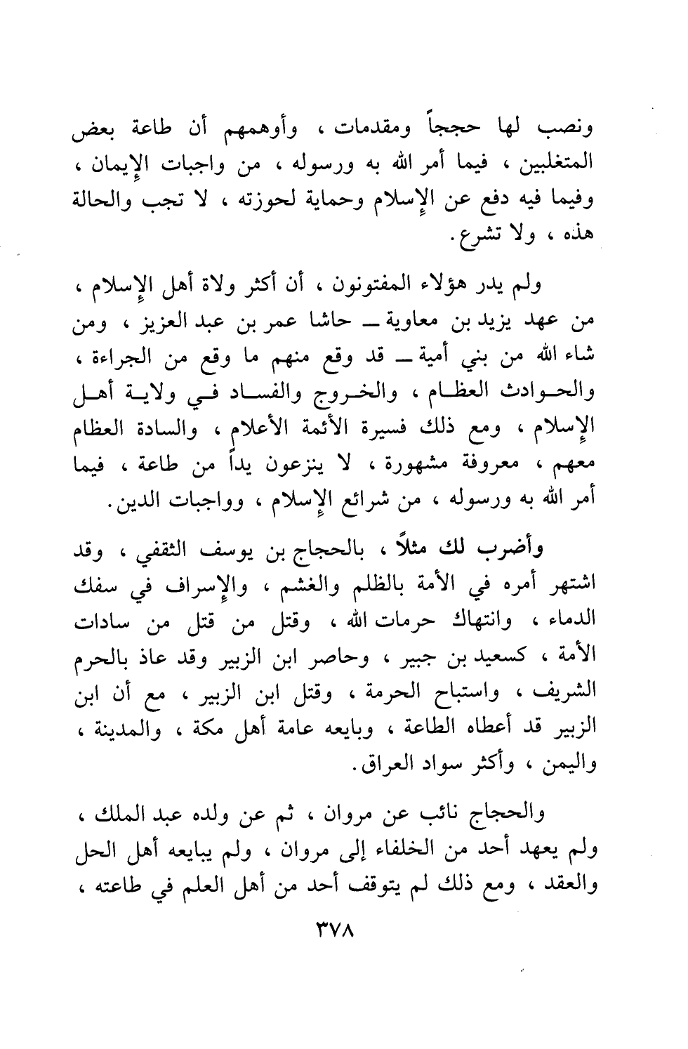 ولم يدر هؤلاء المفتونون، أن أكثر ولاة أهل الإسلام، من عهد يزيد بن معاوية - حاشا عمر بن عبد العزيز، ومن شاء الله من بني أمية - قد وقع منهم ما وقع من الجراءة، والحوادث العظام، والخروج والفساد في ولاية أهل الإسلام؛ ومع ذلك فسيرة الأئمة الأعلام، والسادة العظام معهم، معروفة مشهورة، لا ينزعون يداً من طاعة، فيما أمر الله به ورسوله، من شرائع الإسلام وواجبات الدين.