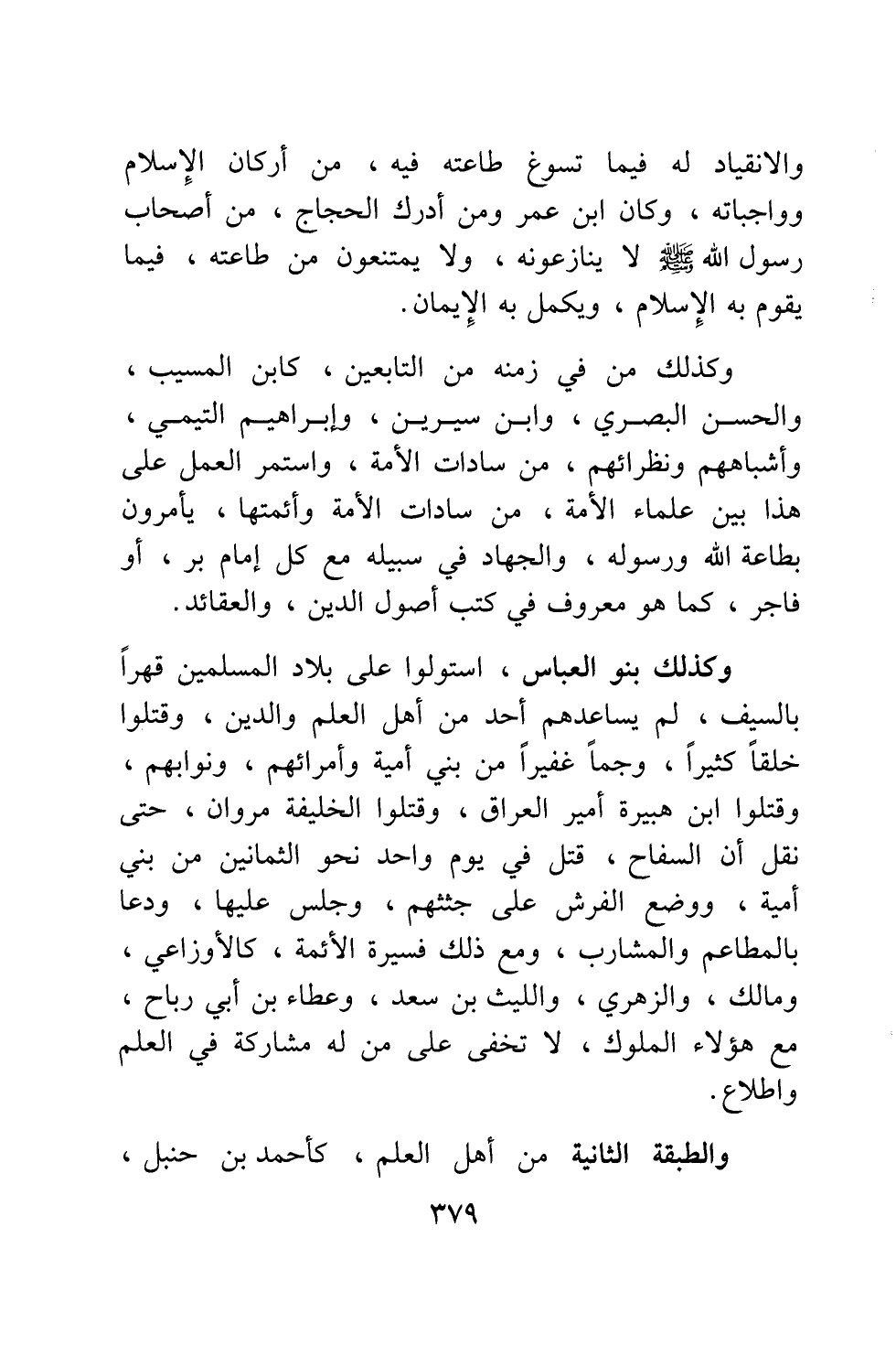 والانقياد له فيما تسوغ طاعته فيه، من أركان الإسلام وواجباته. وكان ابن عمر ومن أدرك الحجاج من أصحاب رسول الله صلى الله عليه وسلم لا ينازعونه، ولا يمتنعون من طاعته، فيما يقوم به الإسلام، ويكمل به الإيمان. وكذلك من في زمنه من التابعين، كابن المسيب، والحسن البصري، وابن سيرين، وإبراهيم التيمي، وأشباههم ونظرائهم من سادات الأمة. واستمر العمل على هذا بين علماء الأمة، من سادات الأمة وأئمتها، يأمرون بطاعة الله ورسوله، والجهاد في سبيله مع كل إمام بر أو فاجر، كما هو معروف في كتب أصول الدين والعقائد.