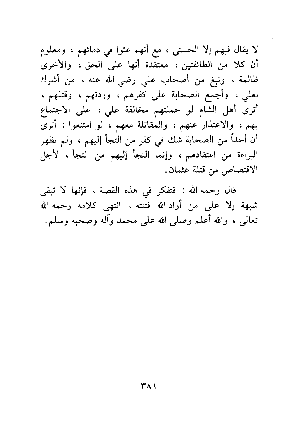 لا يقال فيهم إلا الحسنى، مع أنهم عثوا في دمائهم. ومعلوم أن كلاً من الطائفتين، معتقدة أنها على الحق، والأخرى ظالمة، ونبغ من أصحاب علي رضي الله عنه من أشرك بعلي، وأجمع الصحابة على كفرهم، وردتهم، وقتلهم؛ أترى أهل الشام لو حملتهم مخالفة علي على الاجتماع بهم، والاعتذار عنهم، والمقاتلة معهم، لو امتنعوا، أترى أن أحداً من الصحابة شك في كفر من التجأ إليهم، ولم يظهر البراءة من اعتقادهم، وإنما التجأ إليهم من التجأ، لأجل الاقتصاص من قتلة عثمان؟