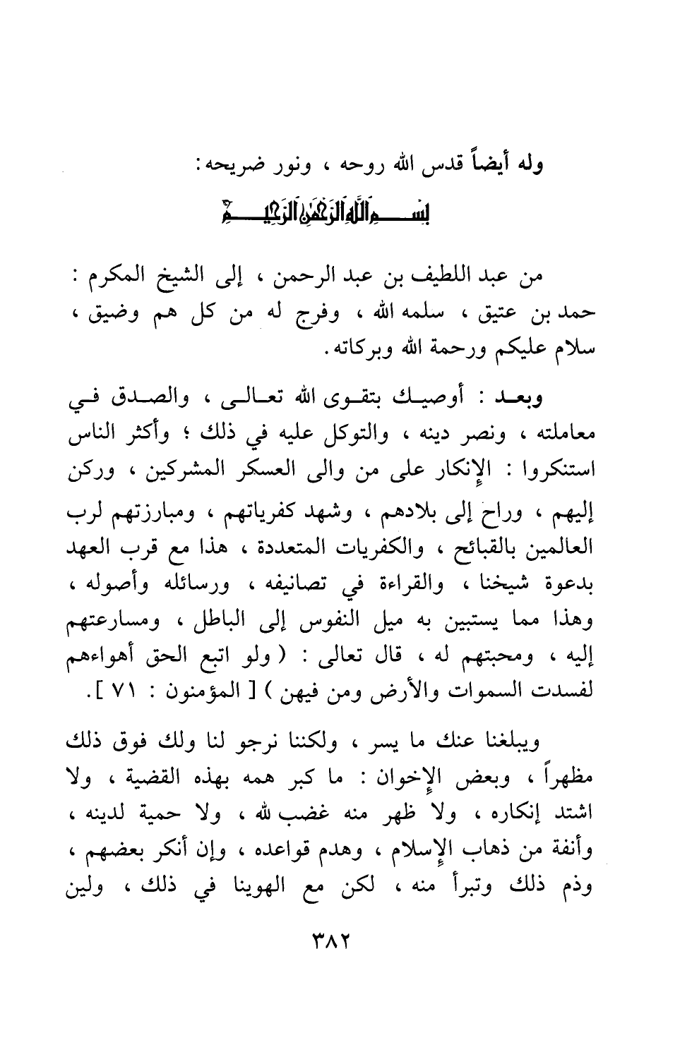 وبعد، أوصيك بتقوى الله تعالى، والصدق في معاملته، ونصر دينه، والتوكل عليه في ذلك. وأكثر الناس استنكروا الإنكار على من والى العسكر المشركين، وركن إليهم، وراح إلى بلادهم، وشهد كفرياتهم، ومبارزتهم لرب العالمين بالقبائح، والكفريات المتعددة؛ هذا مع قرب العهد بدعوة شيخنا، والقراءة في تصانيفه، ورسائله وأصوله، وهذا مما يستبين به ميل النفوس إلى الباطل، ومسارعتهم إليه، ومحبتهم له، قال تعالى: {وَلَوِ اتَّبَعَ الْحَقُّ أَهْوَاءَهُمْ لَفَسَدَتِ السَّمَاوَاتُ وَالْأَرْضُ وَمَنْ فِيهِنَّ} [سورة المؤمنون آية: 71] .
