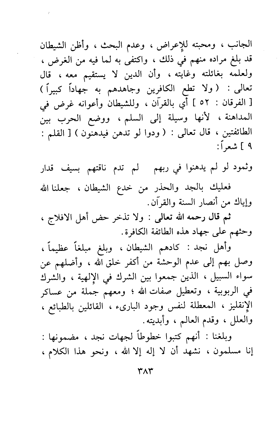 وأهل نجد كادهم الشيطان، وبلغ مبلغاً عظيماً، وصل بهم إلى عدم الوحشة من أكفر خلق الله، وأضلهم عن سواء السبيل، الذين جمعوا بين الشرك في الإلهية، والشرك في الربوبية، وتعطيل صفات الله، ومعهم جملة من عساكر الإنقليز، المعطلة لنفس وجود البارئ، القائلين بالطبائع والعلل، وقدم العالم، وأبديته. وبلغنا أنهم كتبوا خطوطاً لجهات نجد، مضمونها: إنا مسلمون، نشهد أن لا إله إلا الله، ونحو هذا الكلام،
