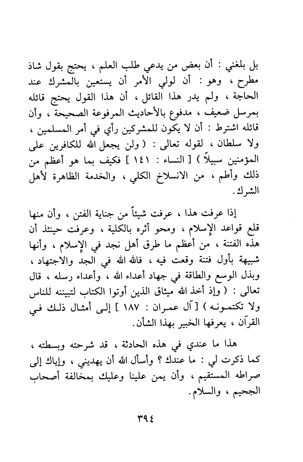 إذا عرفت هذا، عرفت شيئا من جناية الفتن، وأن منها قلع قواعد الإسلام، ومحو أثره بالكلية، وعرفت حينئذ أن هذه الفتنة، من أعظم ما طرق أهل نجد في الإسلام، وأنها شبيهة بأول فتنة وقعت فيه، فالله الله في الجد والاجتهاد، وبذل الوسع والطاقة في جهاد أعداء الله، وأعداء رسله، قال تعالي: (وإذ أخذ الله ميثاق الذين أوتوا الكتاب لتبيننه للناس ولا تكتمونه) آل عمران 187، إلى أمثال ذلك في القرآن، يعرفها الخبير بهذا الشأن.