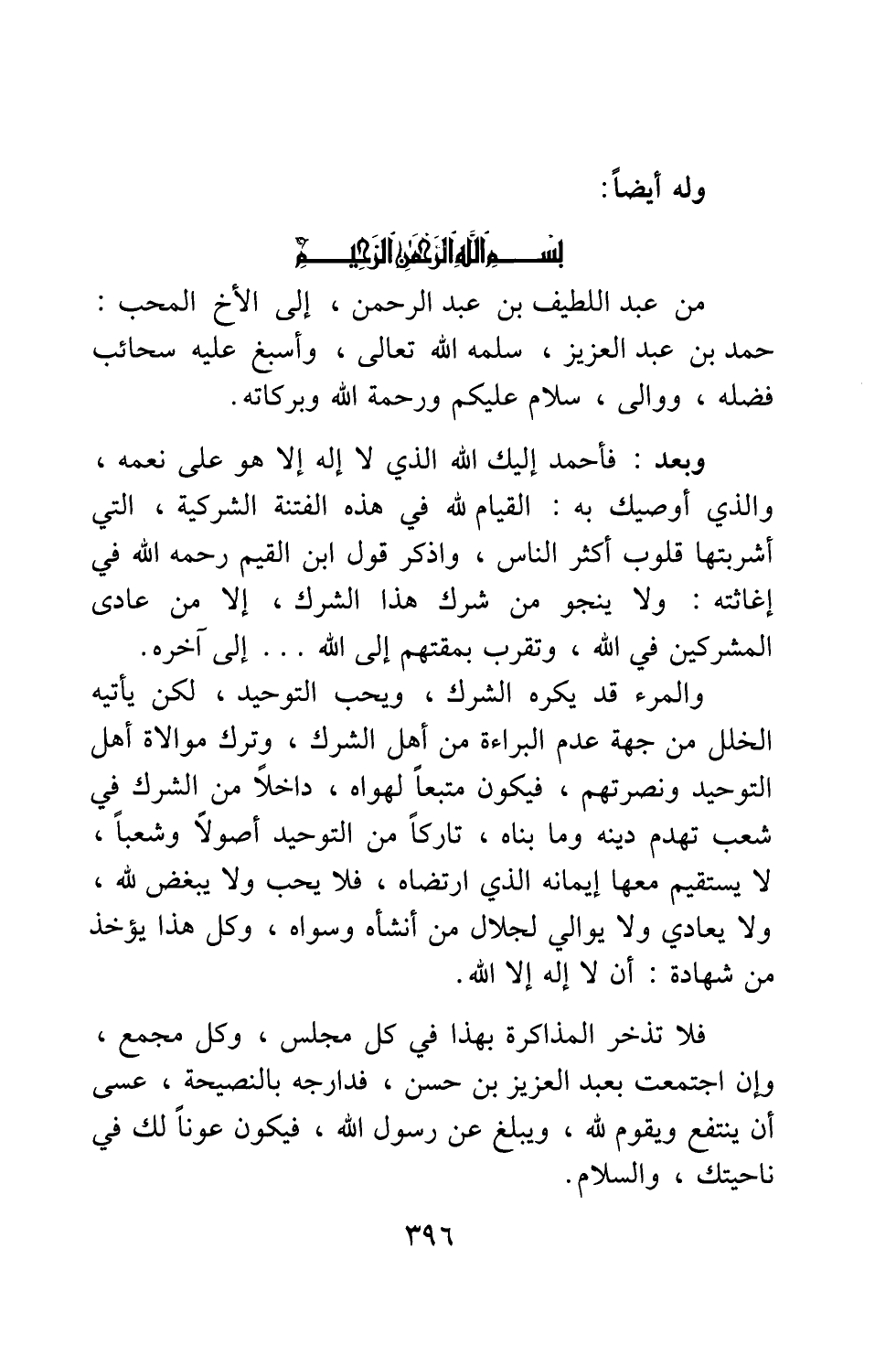 من عبد اللطيف بن عبد الرحمن، إلى الأخ المحب: حمد بن عبد العزيز، سلمه الله تعالى، وأسبغ عليه سحائب فضله، ووالى؛ سلام عليكم ورحمة الله وبركاته.