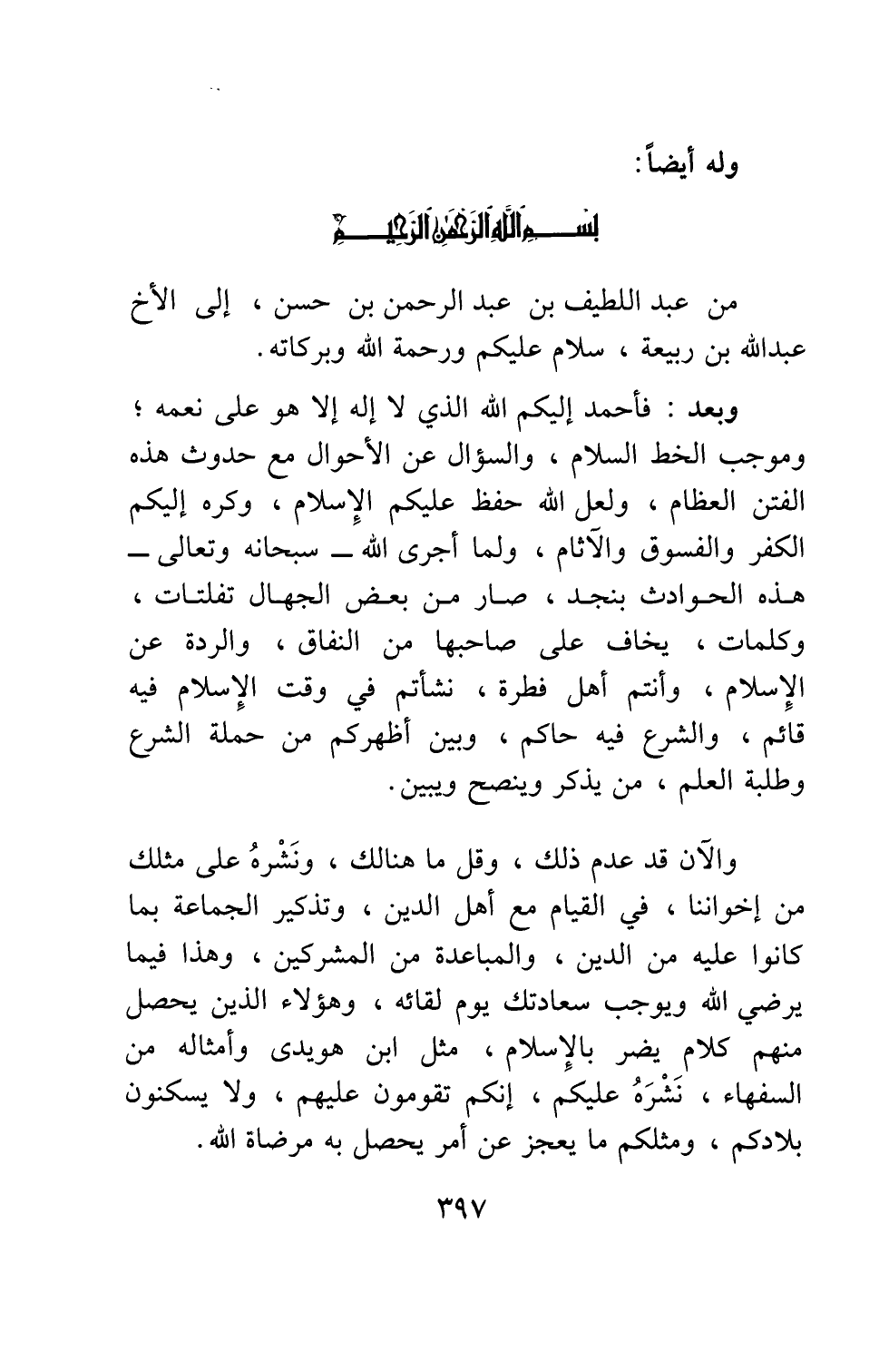 من عبد اللطيف بن عبد الرحمن بن حسن، إلى الأخ عبد الله بن ربيعة، سلام عليكم ورحمة الله وبركاته.