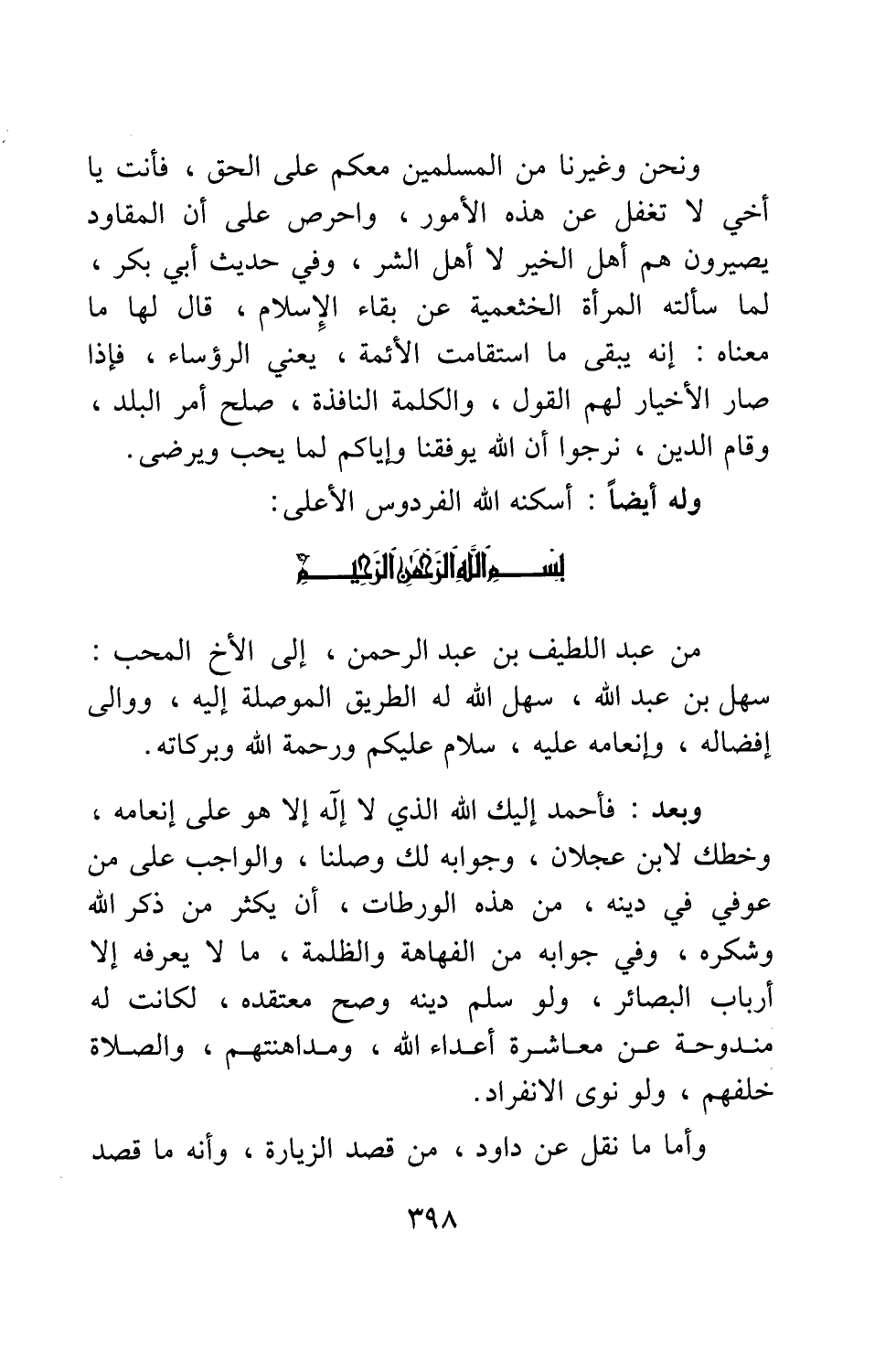 من عبد اللطيف بن عبد الرحمن، إلى الأخ المحب: سهل بن عبد الله، سهل الله له الطريق الموصلة إليه، ووالى إفضاله وإنعامه عليه؛ سلام عليكم ورحمة الله وبركاته.