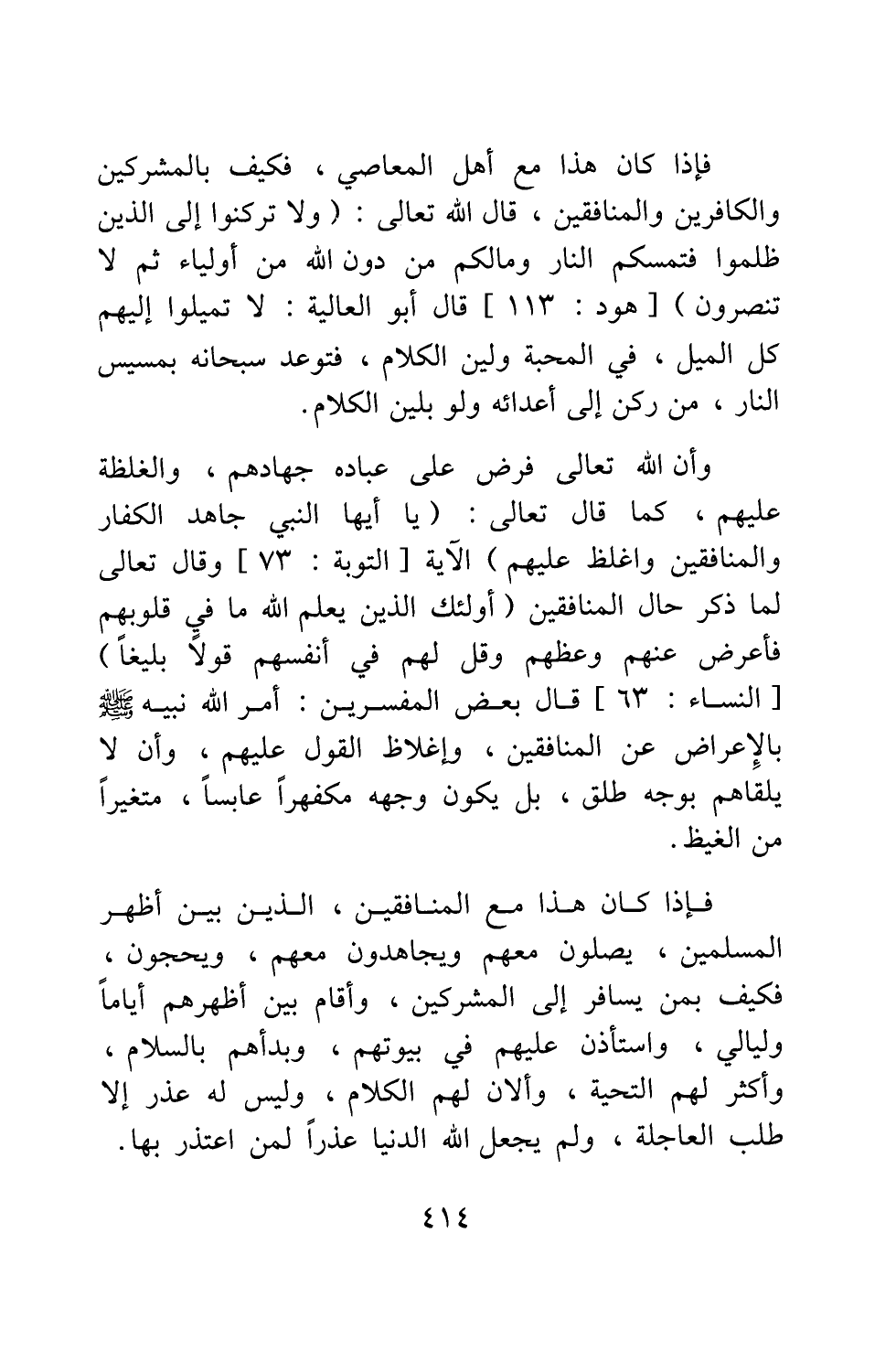 فإذا كان هذا مع أهل المعاصي، فكيف بالمشركين والكافرين والمنافقين؟ قال الله تعالى: {وَلا تَرْكَنُوا إِلَى الَّذِينَ ظَلَمُوا فَتَمَسَّكُمُ النَّارُ وَمَا لَكُمْ مِنْ دُونِ اللَّهِ مِنْ أَوْلِيَاءَ ثُمَّ لا تُنْصَرُونَ} [سورة هود آية: 113] . قال أبو العالية: "لا تميلوا إليهم كل الميل، في المحبة ولين الكلام؛ فتوعد سبحانه بمسيس النار، من ركن إلى أعدائه ولو بلين الكلام".