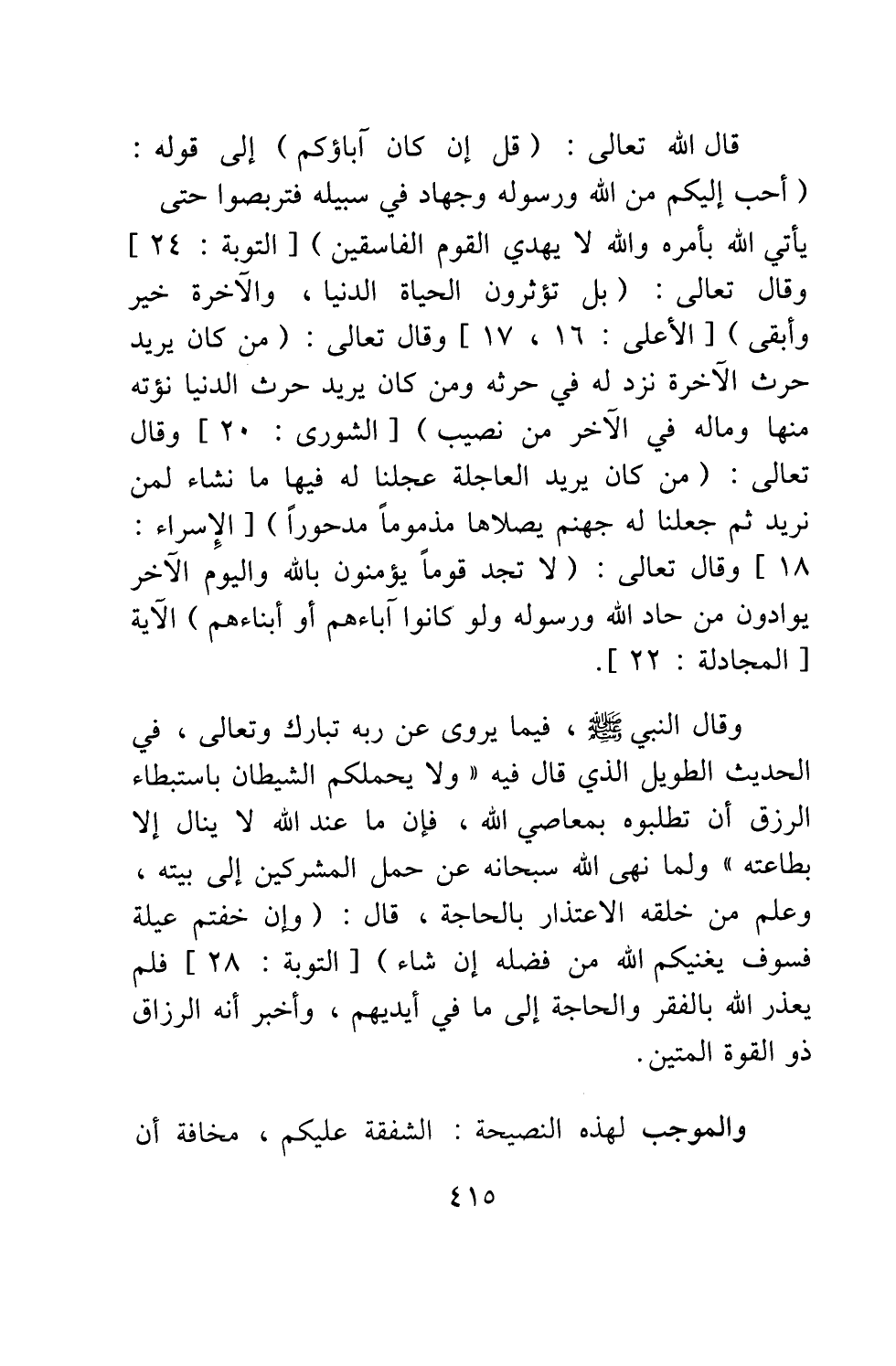 قال الله تعالى: {قُلْ إِنْ كَانَ آبَاؤُكُمْ} إلى قوله: {أَحَبَّ إِلَيْكُمْ مِنَ اللَّهِ وَرَسُولِهِ وَجِهَادٍ فِي سَبِيلِهِ فَتَرَبَّصُوا حَتَّى يَأْتِيَ اللَّهُ بِأَمْرِهِ وَاللَّهُ لا يَهْدِي الْقَوْمَ الْفَاسِقِينَ} [سورة التوبة آية: 24] ، وقال تعالى: {بَلْ تُؤْثِرُونَ الْحَيَاةَ الدُّنْيَا وَالْآخِرَةُ خَيْرٌ وَأَبْقَى} [سورة الأعلى آية: 16-17] ، وقال تعالى: {مَنْ كَانَ يُرِيدُ حَرْثَ الْآخِرَةِ نَزِدْ لَهُ فِي حَرْثِهِ وَمَنْ كَانَ يُرِيدُ حَرْثَ الدُّنْيَا نُؤْتِهِ مِنْهَا وَمَا لَهُ فِي الْآخِرَةِ مِنْ نَصِيبٍ} [سورة الشورى آية: 20] ، وقال تعالى: {مَنْ كَانَ يُرِيدُ الْعَاجِلَةَ عَجَّلْنَا لَهُ فِيهَا مَا نَشَاءُ لِمَنْ نُرِيدُ ثُمَّ جَعَلْنَا لَهُ جَهَنَّمَ يَصْلاهَا مَذْمُوماً مَدْحُوراً} [سورة الإسراء آية: 18] ، وقال تعالى: {لا تَجِدُ قَوْماً يُؤْمِنُونَ بِاللَّهِ وَالْيَوْمِ الْآخِرِ يُوَادُّونَ مَنْ حَادَّ اللَّهَ وَرَسُولَهُ وَلَوْ كَانُوا آبَاءَهُمْ أَوْ أَبْنَاءَهُمْ} الآية [سورة المجادلة آية: 22] .