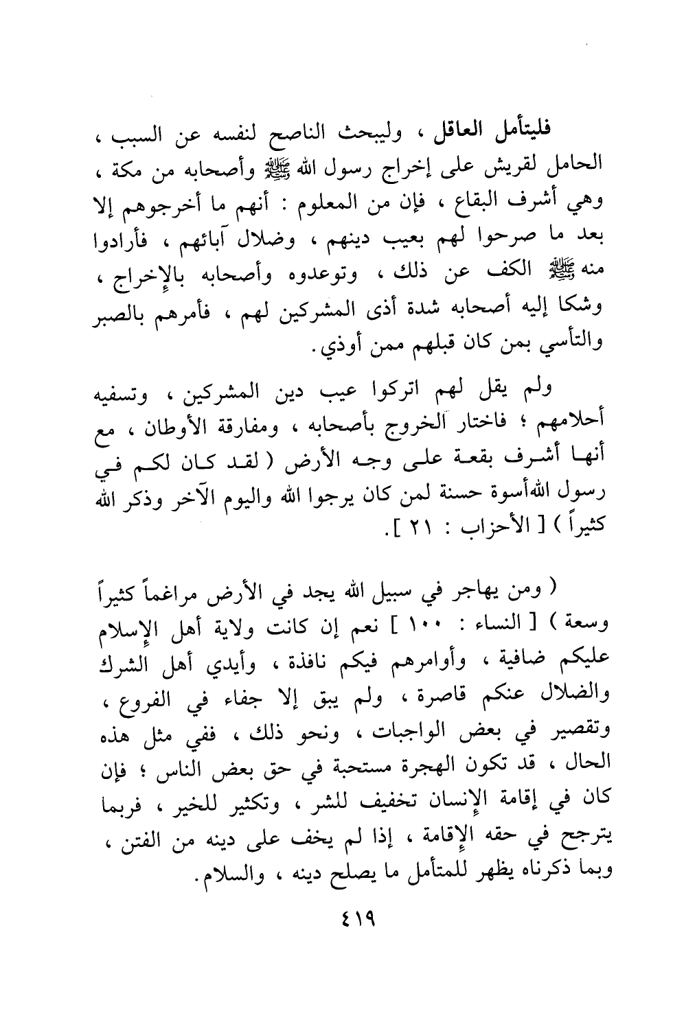 فليتأمل العاقل، وليبحث الناصح لنفسه عن السبب الحامل لقريش على إخراج رسول الله صلى الله عليه وسلم وأصحابه من مكة، وهي أشرف البقاع؛ فإن من المعلوم: أنهم ما أخرجوهم إلا بعد ما صرحوا لهم بعيب دينهم، وضلال آبائهم، فأرادوا منه صلى الله عليه وسلم الكف عن ذلك، وتوعدوه وأصحابه بالإخراج. وشكا إليه أصحابه شدة أذى المشركين لهم، فأمرهم بالصبر والتأسي بمن كان قبلهم ممن أوذي، ولم يقل لهم: اتركوا عيب دين المشركين، وتسفيه أحلامهم. فاختار الخروج بأصحابه، ومفارقة الأوطان، مع أنها أشرف بقعة على وجه الأرض. {لَقَدْ كَانَ لَكُمْ فِي رَسُولِ اللَّهِ أُسْوَةٌ حَسَنَةٌ لِمَنْ كَانَ يَرْجُو اللَّهَ وَالْيَوْمَ الْآخِرَ وَذَكَرَ اللَّهَ كَثِيرا} [سورة الأحزاب آية: 21] ، {وَمَنْ يُهَاجِرْ فِي سَبِيلِ اللَّهِ يَجِدْ فِي الْأَرْضِ مُرَاغَماً كَثِيراً وَسَعَةً} [سورة النساء آية: 100] . نعم، إن كانت ولاية أهل الإسلام عليكم ضافية، وأوامرهم فيكم نافذة، وأيدي أهل الشرك والضلال عنكم قاصرة، ولم يبق إلا جفاء في الفروع، وتقصير في بعض الواجبات، ونحو ذلك، ففي مثل هذه الحال، قد تكون الهجرة مستحبة في حق بعض الناس; فإن كان في إقامة الإنسان تخفيف للشر، وتكثير للخير، فربما يترجح في حقه الإقامة، إذا لم يخف على دينه من الفتن. وبما ذكرناه يظهر للمتأمل ما يصلح دينه، والسلام.