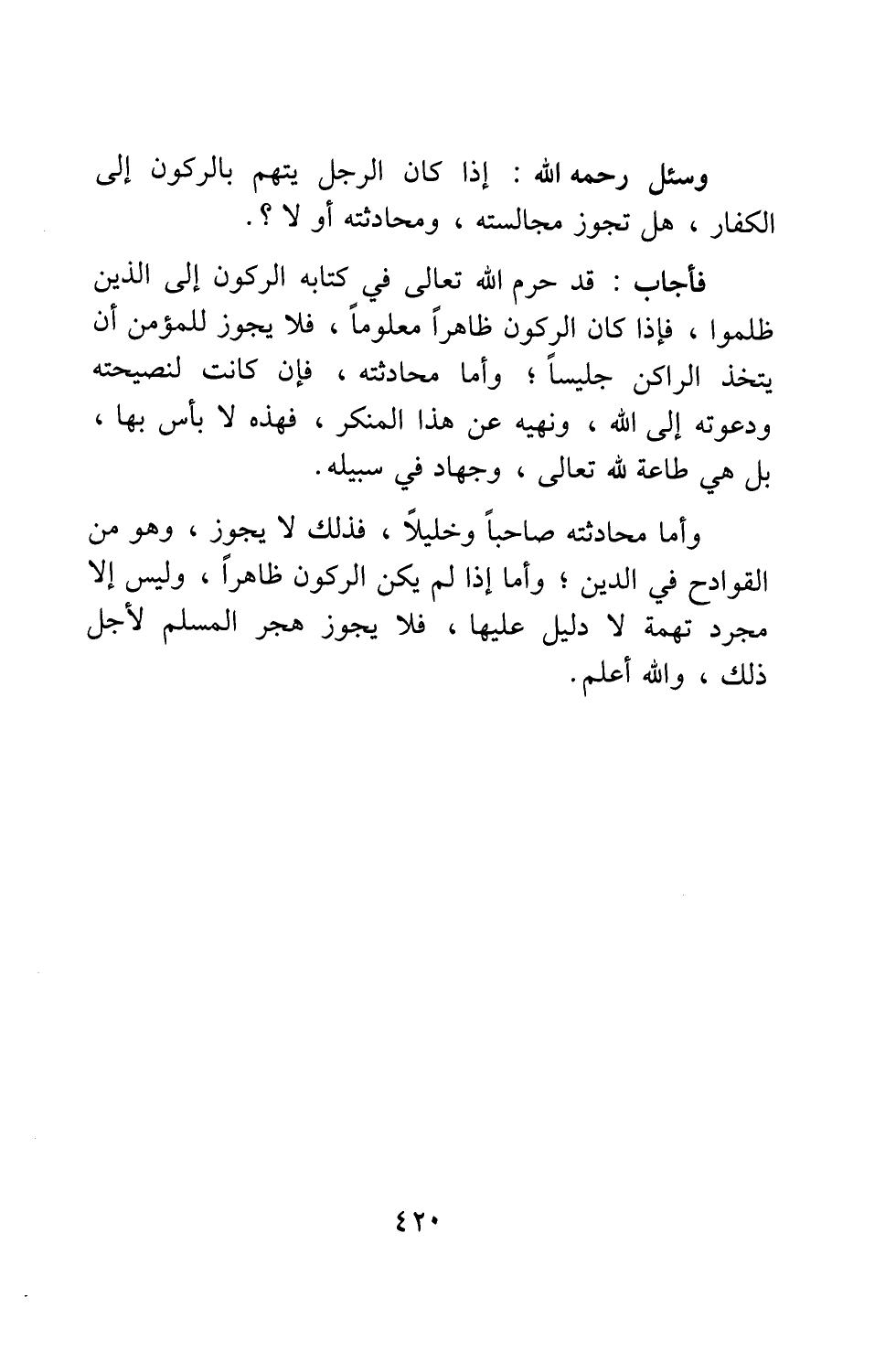 فأجاب: قد حرّم الله تعالى في كتابه الركون إلى الذين ظلموا، فإذا كان الركون ظاهراً معلوماً، فلا يجوز للمؤمن أن يتخذ الراكن جليساً; وأما محادثته، فإن كانت لنصيحته ودعوته إلى الله، ونهيه عن هذا المنكر، فهذه لا بأس بها، بل هي طاعة لله تعالى، وجهاد في سبيله. وأما محادثته صاحباً وخليلاً، فذلك لا يجوز، وهو من القوادح في الدين. وأما إذا لم يكن الركون ظاهراً، وليس إلا مجرد تهمة لا دليل عليها، فلا يجوز هجر المسلم لأجل ذلك، والله أعلم.