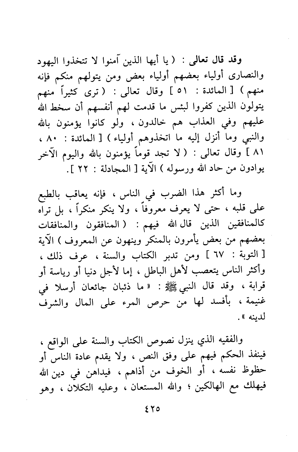 وقد قال تعالى: {يَا أَيُّهَا الَّذِينَ آمَنُوا لا تَتَّخِذُوا الْيَهُودَ وَالنَّصَارَى أَوْلِيَاءَ بَعْضُهُمْ أَوْلِيَاءُ بَعْضٍ وَمَنْ يَتَوَلَّهُمْ مِنْكُمْ فَإِنَّهُ مِنْهُمْ} [سورة المائدة آية: 51] ، وقال تعالى: {تَرَى كَثِيراً مِنْهُمْ يَتَوَلَّوْنَ الَّذِينَ كَفَرُوا لَبِئْسَ مَا قَدَّمَتْ لَهُمْ أَنْفُسُهُمْ أَنْ سَخِطَ اللَّهُ عَلَيْهِمْ وَفِي الْعَذَابِ هُمْ خَالِدُونَ وَلَوْ كَانُوا يُؤْمِنُونَ بِاللَّهِ وَالنَّبِيِّ وَمَا أُنْزِلَ إِلَيْهِ مَا اتَّخَذُوهُمْ أَوْلِيَاءَ} [سورة المائدة آية: 80-81] ، وقال تعالى: {لا تَجِدُ قَوْماً يُؤْمِنُونَ بِاللَّهِ وَالْيَوْمِ الْآخِرِ يُوَادُّونَ مَنْ حَادَّ اللَّهَ وَرَسُولَهُ} الآية [سورة المجادلة آية: 22] . وما أكثر هذا الضرب في الناس! فإنه يعاقب بالطبع على قلبه، حتى لا يعرف معروفاً، ولا ينكر منكراً، بل تراه كالمنافقين الذين قال الله فيهم: {الْمُنَافِقُونَ وَالْمُنَافِقَاتُ بَعْضُهُمْ مِنْ بَعْضٍ يَأْمُرُونَ بِالْمُنْكَرِ وَيَنْهَوْنَ عَنِ الْمَعْرُوفِ} الآية [سورة التوبة آية: 67] . ومن تدبر الكتاب والسنة، عرف ذلك. وأكثر الناس يتعصب لأهل الباطل، إما لأجل دنيا أو رياسة أو قرابة؛ وقد قال النبي صلى الله عليه وسلم: "ما ذئبان جائعان أرسلا في غنيمة، بأفسد لها من حرص المرء على المال والشرف لدينه " 1. والفقيه الذي ينزل نصوص الكتاب والسنة على الواقع، فينفذ الحكم فيهم على وفق النص، ولا يقدم عادة الناس أو حظوظ نفسه، أو الخوف من أذاهم، فيداهن في دين الله فيهلك مع الهالكين; والله المستعان، وعليه التكلان، وهو
