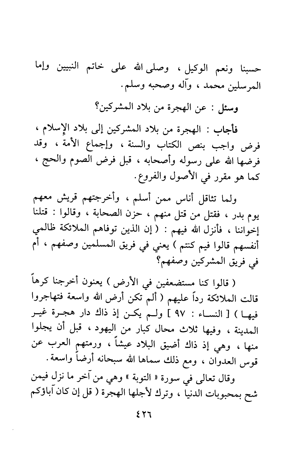 فأجاب: الهجرة من بلاد المشركين إلى بلاد الإسلام، فرض واجب بنص الكتاب والسنة، وإجماع الأمة؛ وقد فرضها الله على رسوله وأصحابه، قبل فرض الصوم والحج، كما هو مقرر في الأصول والفروع.