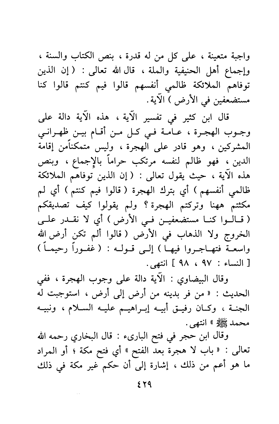 وقال البيضاوي: الآية دالة على وجوب الهجرة، ففي الحديث: "من فر بدينه من أرض إلى أرض، استوجبت له الجنة، وكان رفيق أبيه إبراهيم عليه السلام، ونبيه محمد صلى الله عليه وسلم". انتهى. وقال ابن حجر في فتح الباري: قال البخاري، رحمه الله تعالى: باب لا هجرة بعد الفتح، أي: فتح مكة، أو المراد ما هو أعم من ذلك، إشارة إلى أن حكم غير مكة في ذلك