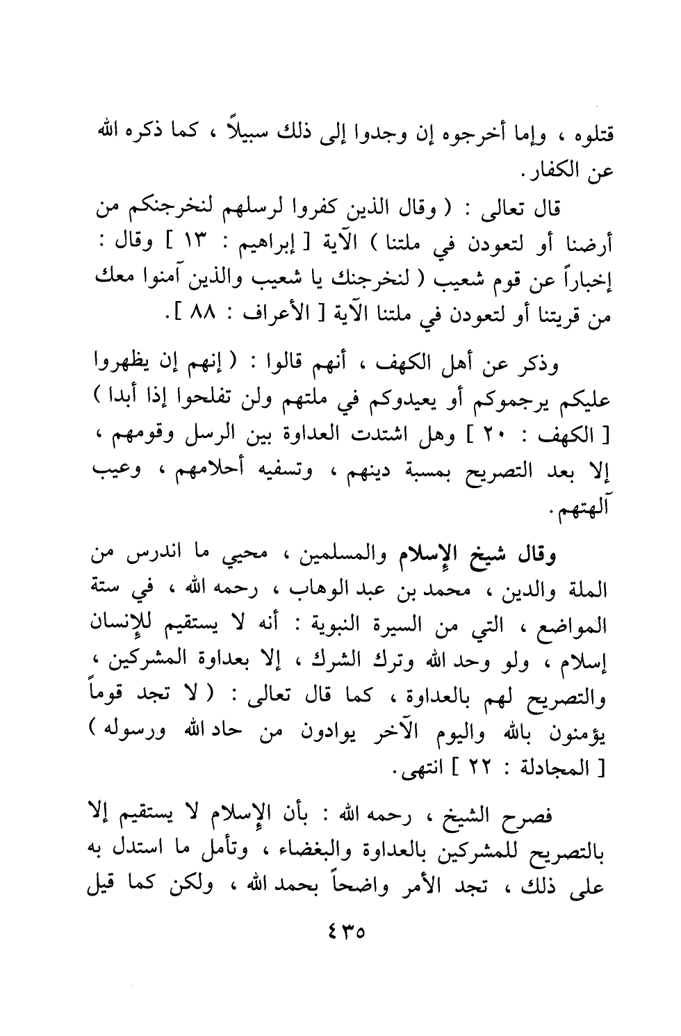 وقال شيخ الإسلام والمسلمين، محيي ما اندرس من الملة والدين، محمد بن عبد الوهاب، رحمه الله، في ستة المواضع التي من السيرة النبوية: أنه لا يستقيم للإنسان إسلام، ولو وحد الله وترك الشرك، إلا بعداوة المشركين، والتصريح لهم بالعداوة، كما قال تعالى: {لا تَجِدُ قَوْماً يُؤْمِنُونَ بِاللَّهِ وَالْيَوْمِ الْآخِرِ يُوَادُّونَ مَنْ حَادَّ اللَّهَ وَرَسُولَهُ} [سورة المجادلة آية: 22] . انتهى. فصرح الشيخ، رحمه الله، بأن الإسلام لا يستقيم إلا بالتصريح للمشركين بالعداوة والبغضاء. وتأمل ما استدل به على ذلك، تجد الأمر واضحاً بحمد الله، ولكن كما قيل