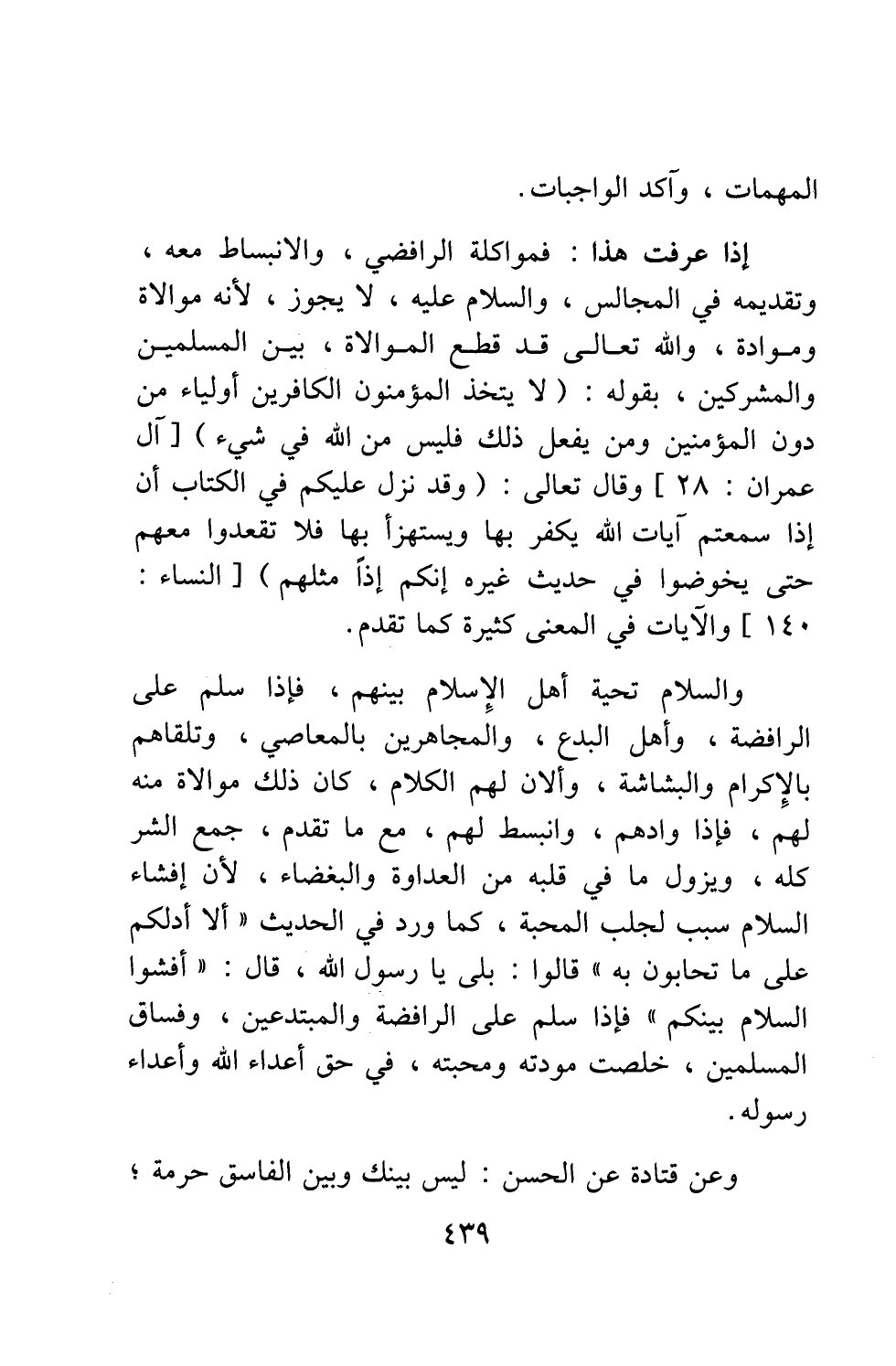 والسلام تحية أهل الإسلام بينهم، فإذا سلم على الرافضة، وأهل البدع، والمجاهرين بالمعاصي، وتلقاهم بالإكرام والبشاشة، وألان لهم الكلام، كان ذلك موالاة منه لهم. فإذا وادهم، وانبسط لهم، مع ما تقدم، جمع الشر كله، ويزول ما في قلبه من العداوة والبغضاء، لأن إفشاء السلام سبب لجلب المحبة، كما ورد في الحديث: " ألا أدلكم على ما تحابون به؟ قالوا: بلى يا رسول الله. قال: أفشوا السلام بينكم ". فإذا سلم على الرافضة والمبتدعين، وفساق المسلمين، خلصت مودته ومحبته، في حق أعداء الله وأعداء رسوله. وعن قتادة عن الحسن: "ليس بينك وبين الفاسق حرمة".