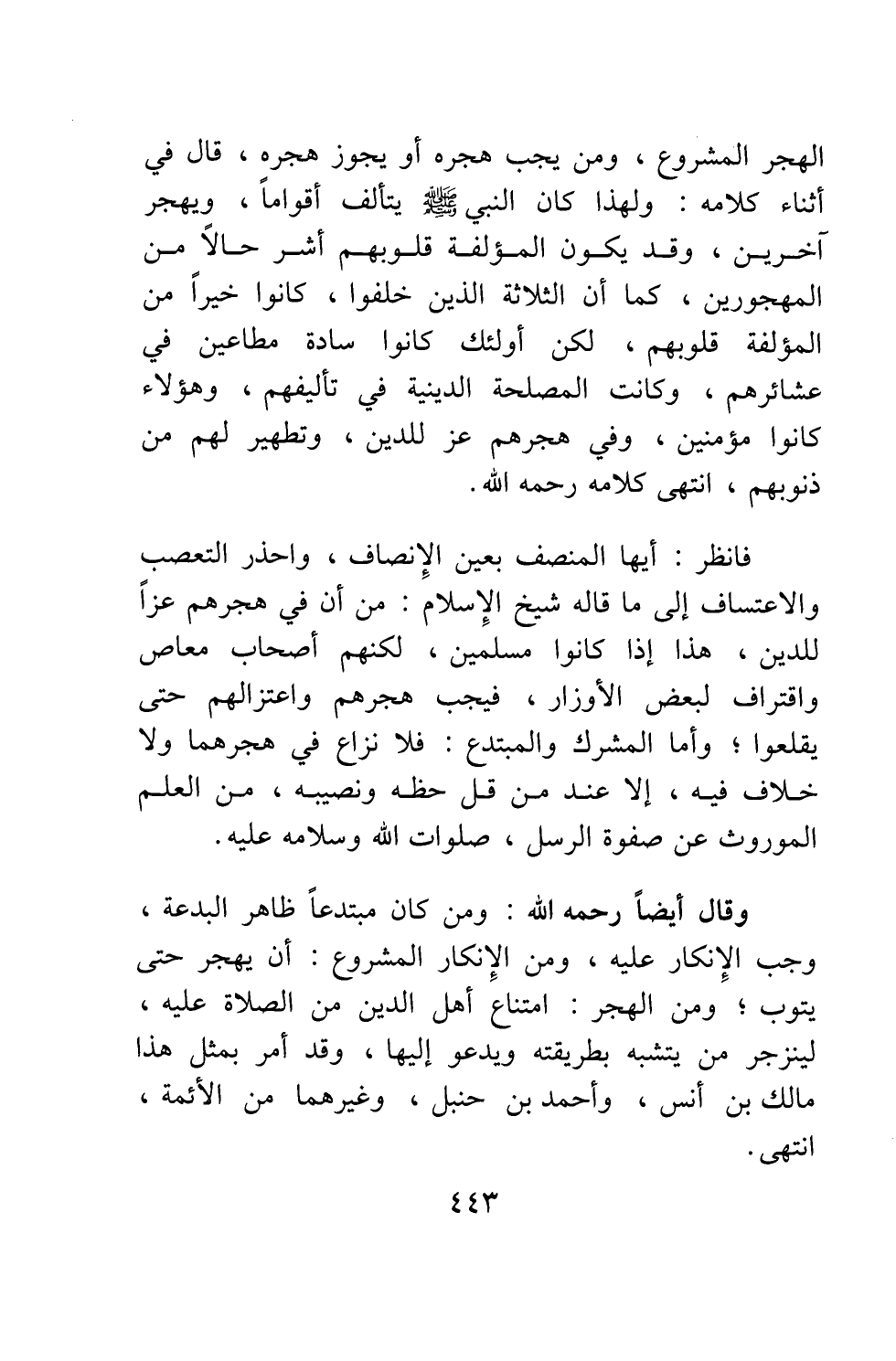 فانظر، أيها المنصف، بعين الإنصاف، واحذر التعصب والاعتساف، إلى ما قاله شيخ الإسلام من أن في هجرهم عزاً للدين، هذا إذا كانوا مسلمين، لكنهم أصحاب معاص واقتراف لبعض الأوزار، فيجب هجرهم واعتزالهم حتى يقلعوا; وأما المشرك والمبتدع، فلا نزاع في هجرهما، ولا خلاف فيه إلا عند من قل حظه ونصيبه من العلم الموروث عن صفوة الرسل، صلوات الله وسلامه عليه.