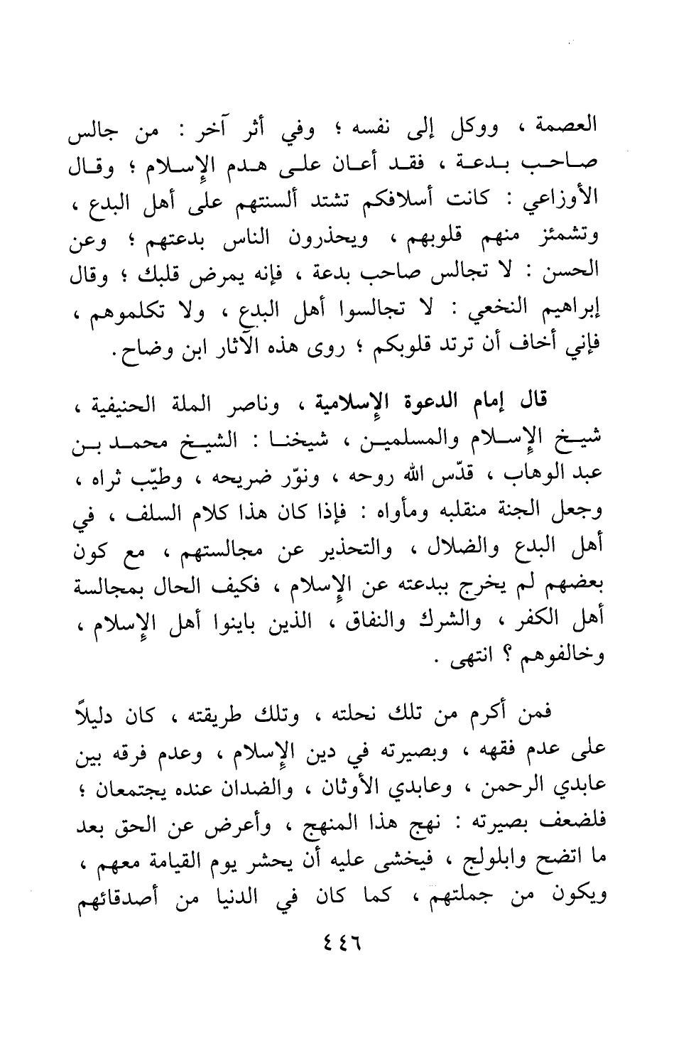 قال إمام الدعوة الإسلامية، وناصر الملة الحنيفية، شيخ الإسلام والمسلمين، شيخنا: الشيخ محمد بن عبد الوهاب، قدس الله روحه، ونور ضريحه، وطيب ثراه، وجعل الجنة منقلبه ومأواه: فإذا كان هذا كلام السلف في أهل البدع والضلال، والتحذير عن مجالستهم، مع كون بعضهم لم يخرج ببدعته عن الإسلام، فكيف الحال بمجالسة أهل الكفر، والشرك والنفاق، الذين باينوا أهل الإسلام، وخالفوهم؟ انتهى.