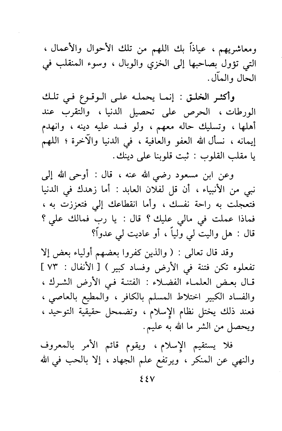 وعن ابن مسعود رضي الله عنه قال: "أوحى الله إلى نبي من الأنبياء، أن قل لفلان العابد: أما زهدك في الدنيا فتعجلت به راحة نفسك، وأما انقطاعك إلي فتعززت به، فماذا عملت في ما لي عليك؟ قال: يا رب، فما لك عليّ؟ قال: هل واليت لي ولياً، أو عاديت لي عدواً؟ ". وقد قال تعالى: {وَالَّذِينَ كَفَرُوا بَعْضُهُمْ أَوْلِيَاءُ بَعْضٍ إِلَّا تَفْعَلُوهُ تَكُنْ فِتْنَةٌ فِي الأَرْضِ وَفَسَادٌ كَبِيرٌ} [سورة الأنفال آية: 73] ، قال بعض العلماء الفضلاء: الفتنة في الأرض: الشرك، والفساد الكبير: اختلاط المسلم بالكافر، والمطيع بالعاصي؛ فعند ذلك يختل نظام الإسلام، وتضمحل حقيقية التوحيد، ويحصل من الشر ما الله به عليم.