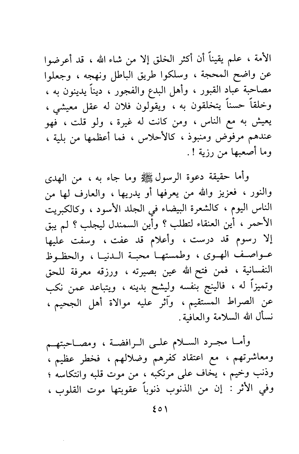 وأما حقيقة دعوة الرسول صلى الله عليه وسلم، وما جاء به من الهدى والنور، فعزيز والله من يعرفها أو يدريها؛ والعارف لها من الناس اليوم، كالشعرة البيضاء في الجلد الأسود، وكالكبريت الأحمر. أين العنقاء لتطلب؟ وأين السمندل ليجلب؟ لم يبق إلا رسوم قد درست، وأعلام قد عفت، وسفت عليها عواصف الهوى، وطمستها محبة الدنيا، والحظوظ النفسانية. فمن فتح الله عين بصيرته، ورزقه معرفة للحق وتميزاً له، فلينج بنفسه، وليشح بدينه، ويتباعد عمن نكب عن الصراط المستقيم، وآثر عليه موالاة أهل الجحيم، نسأل الله السلامة والعافية.
