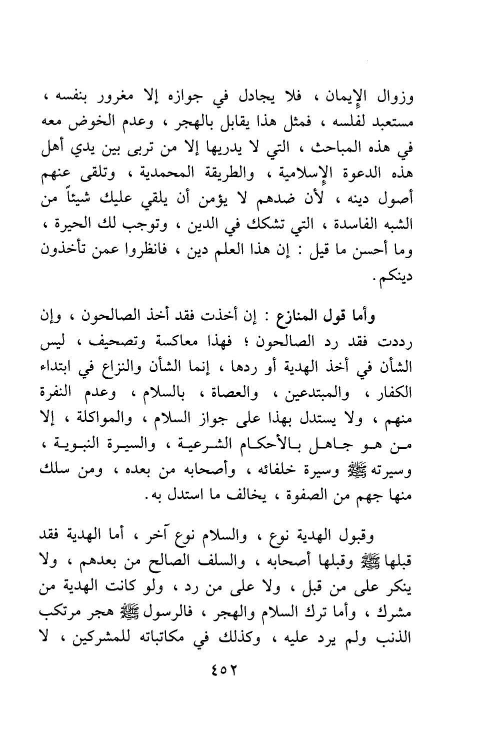 وأما قول المنازع: إن أخذت فقد أخذ الصالحون، وإن رددت فقد رد الصالحون، فهذا معاكسة وتصحيف؛ ليس الشأن في أخذ الهدية أو ردها، إنما الشأن والنزاع في ابتداء الكفار، والمبتدعين، والعصاة، بالسلام، وعدم النفرة منهم. ولا يستدل بهذا على جواز السلام والمواكلة، إلا من هو جاهل بالأحكام الشرعية، والسيرة النبوية. وسيرته صلى الله عليه وسلم وسيرة خلفائه، وأصحابه من بعده، ومن سلك منهاجهم من الصفوة، يخالف ما استدل به. وقبول الهدية نوع، والسلام نوع آخر: أما الهدية فقد قبلها صلى الله عليه وسلم وقبلها أصحابه، والسلف الصالح من بعدهم، ولا ينكر على من قبل، ولا على من رد، ولو كانت الهدية من مشرك. وأما ترك السلام والهجر، فالرسول صلى الله عليه وسلم هجر مرتكب الذنب ولم يرد عليه؛، وكذلك في مكاتباته للمشركين، لا