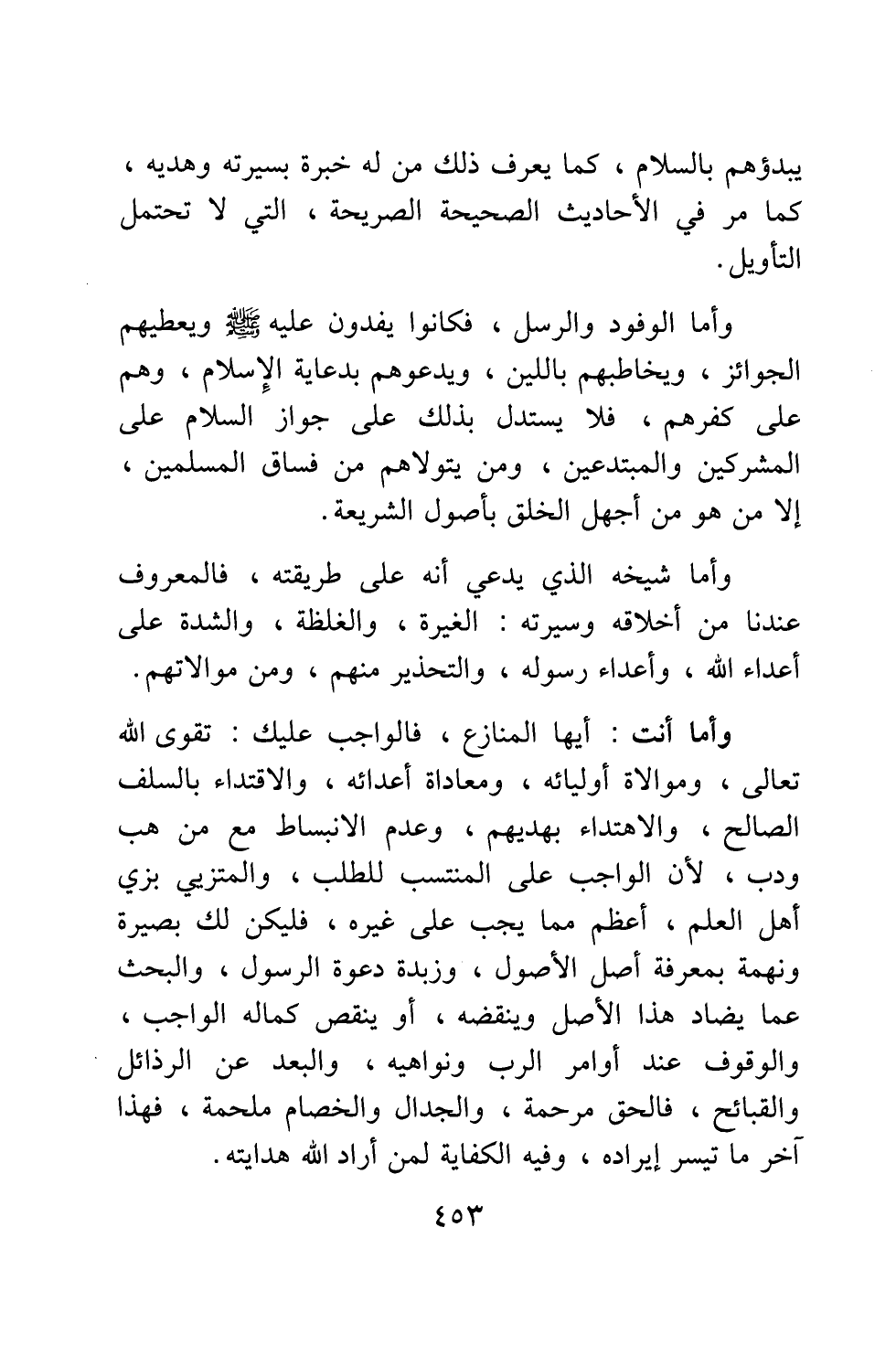 وأما الوفود والرسل، فكانوا يفدون عليه صلى الله عليه وسلم ويعطيهم الجوائز، ويخاطبهم باللين، ويدعوهم بدعاية الإسلام، وهم على كفرهم؛ فلا يستدل بذلك على جواز السلام على المشركين والمبتدعين، ومن يتولاهم من فساق المسلمين، إلا من هو من أجهل الخلق بأصول الشريعة. وأما شيخه الذي يدعي أنه على طريقته، فالمعروف عندنا من أخلاقه وسيرته: الغيرة، والغلظة، والشدة على أعداء الله، وأعداء رسوله، والتحذير منهم، ومن موالاتهم. وأما أنت، أيها المنازع، فالواجب عليك: تقوى الله تعالى، وموالاة أوليائه، ومعاداة أعدائه، والاقتداء بالسلف الصالح، والاهتداء بهديهم، وعدم الانبساط مع من هب ودب، لأن الواجب على المنتسب للطلب، والمتزيي بزي أهل العلم، أعظم مما يجب على غيره؛ فليكن لك بصيرة ونهمة بمعرفة أصل الأصول، وزبدة دعوة الرسول، والبحث عما يضاد هذا الأصل وينقضه، أو ينقص كماله الواجب، والوقوف عند أوامر الرب ونواهيه، والبعد عن الرذائل والقبائح، فالحق مرحمة، والجدال والخصام ملحمة. فهذا آخر ما تيسر إيراده، وفيه الكفاية لمن أراد الله هدايته.
